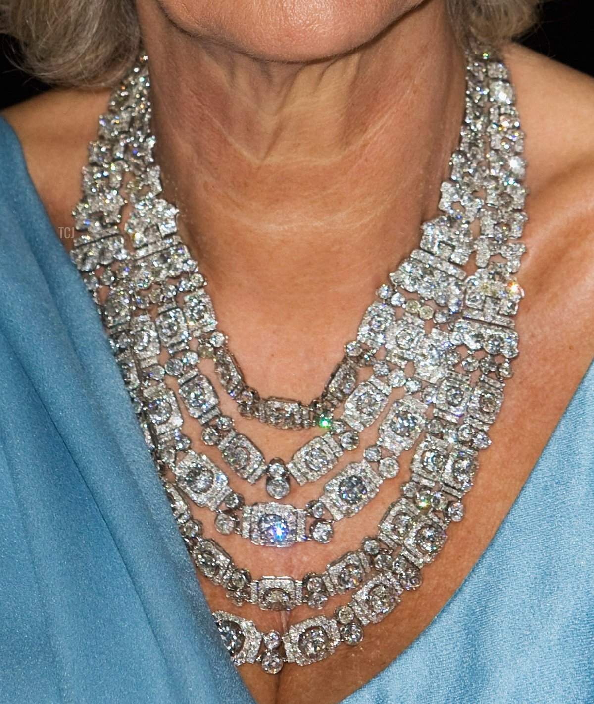 In June 2015, she wore the same combination of jewels—the five-row necklace, the Greville Tiara, and the pear-shaped cluster earrings—for a dinner at Apsley House in London celebrating the 200th anniversary of the Duke of Wellington’s Waterloo banquets.