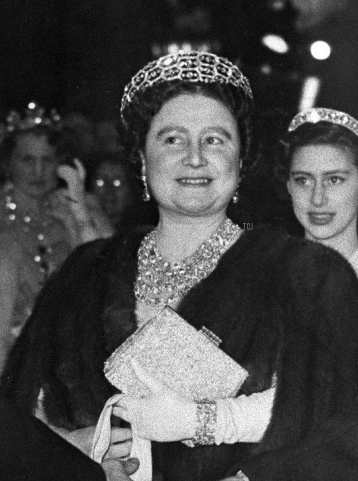 The necklace was one of the pieces from the Greville bequest that Queen Elizabeth (the Queen Mother) kept for herself. (She gifted other pieces from the inheritance to her daughters.) She began wearing the necklace for gala occasions after the war. Here, she pairs all five rows of the necklace with the Greville Tiara (in its original setting) and Queen Victoria’s Diamond Bracelet for a dinner during the Dutch state visit in 1950.