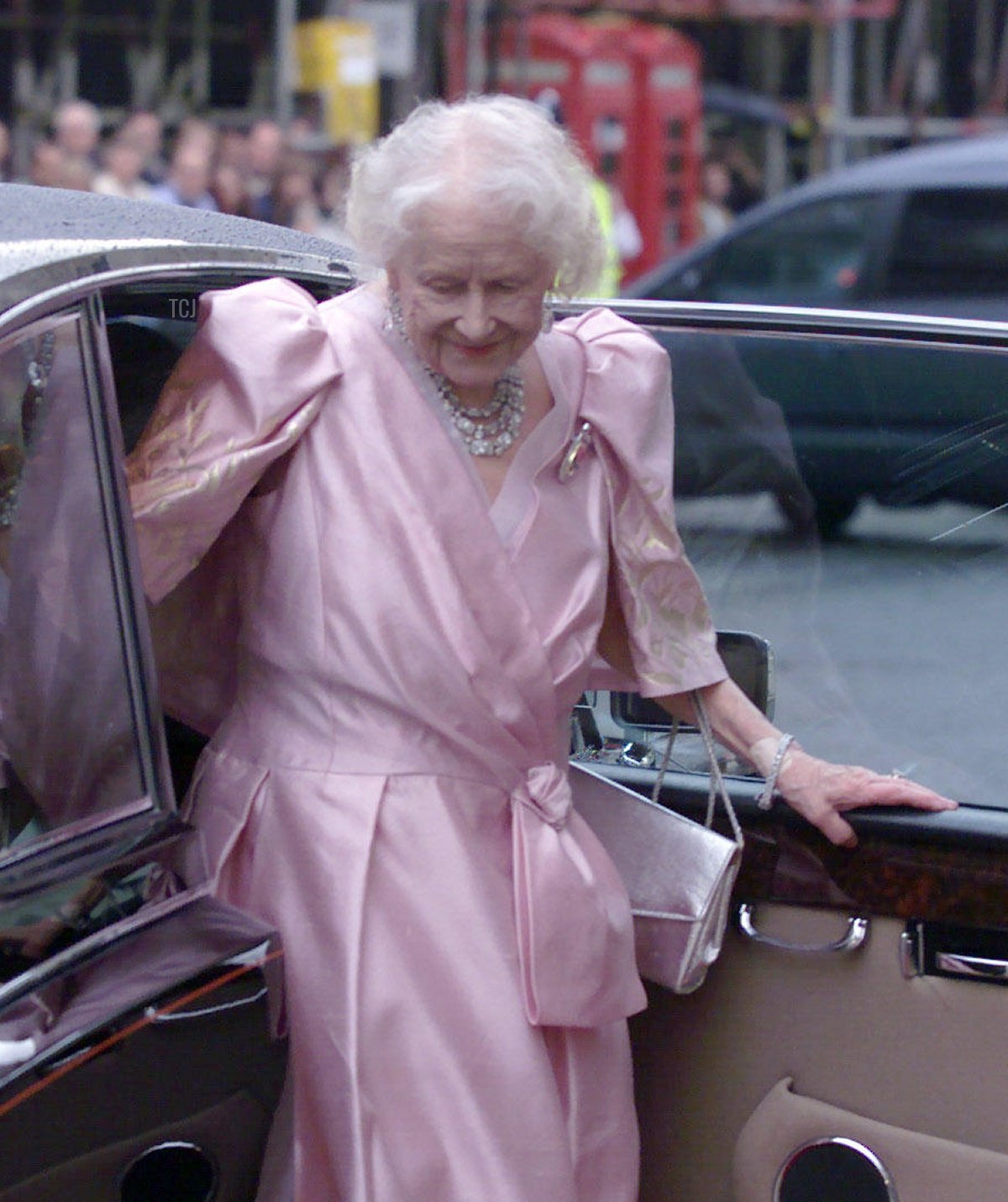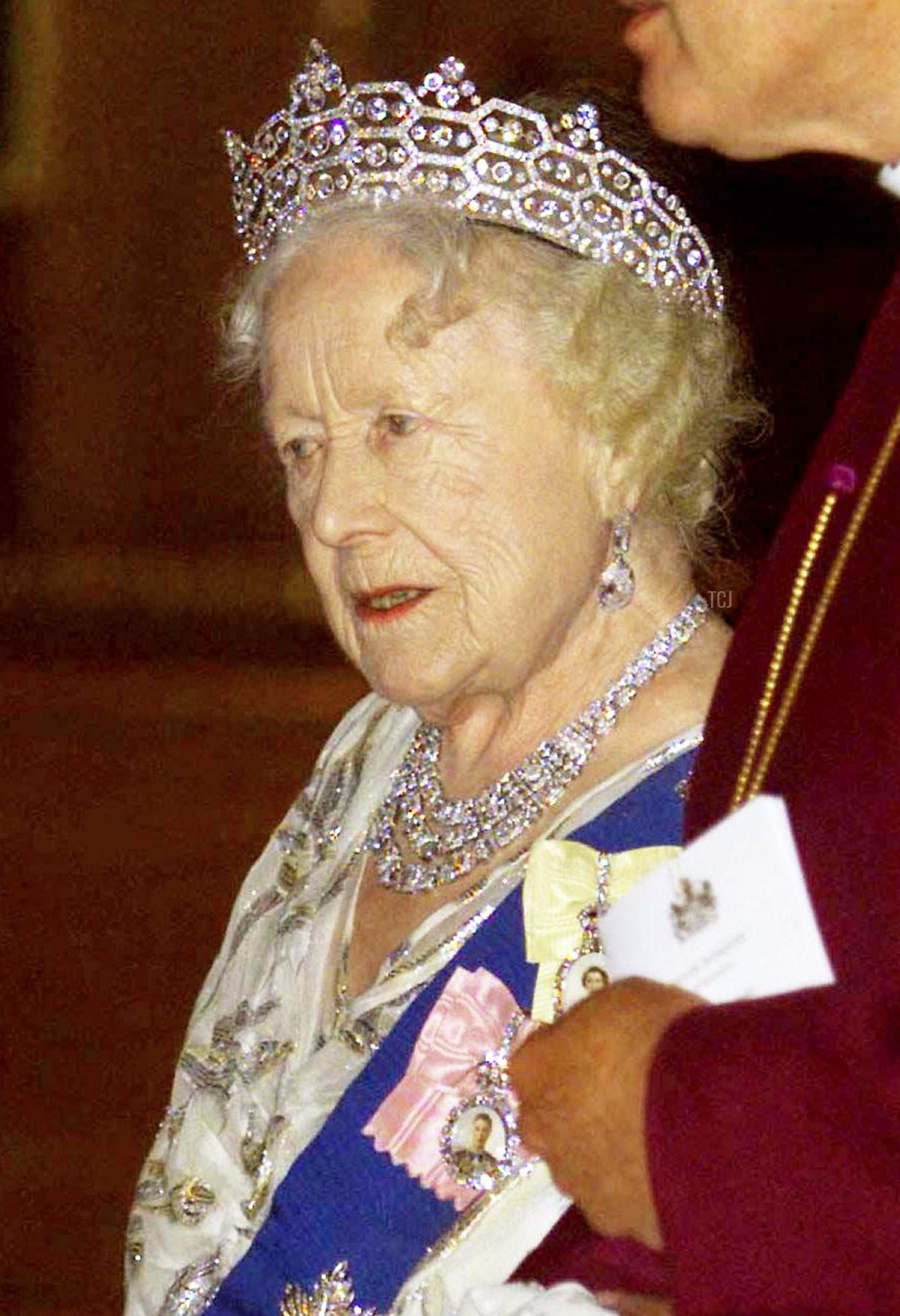 She continued to wear the necklace throughout her long life, though she preferred to wear only three rows of the necklace in her later years. Here, in December 1998, she pairs the three-row version of the necklace with the renovated Greville Tiara and the Greville Peardrop Earrings.