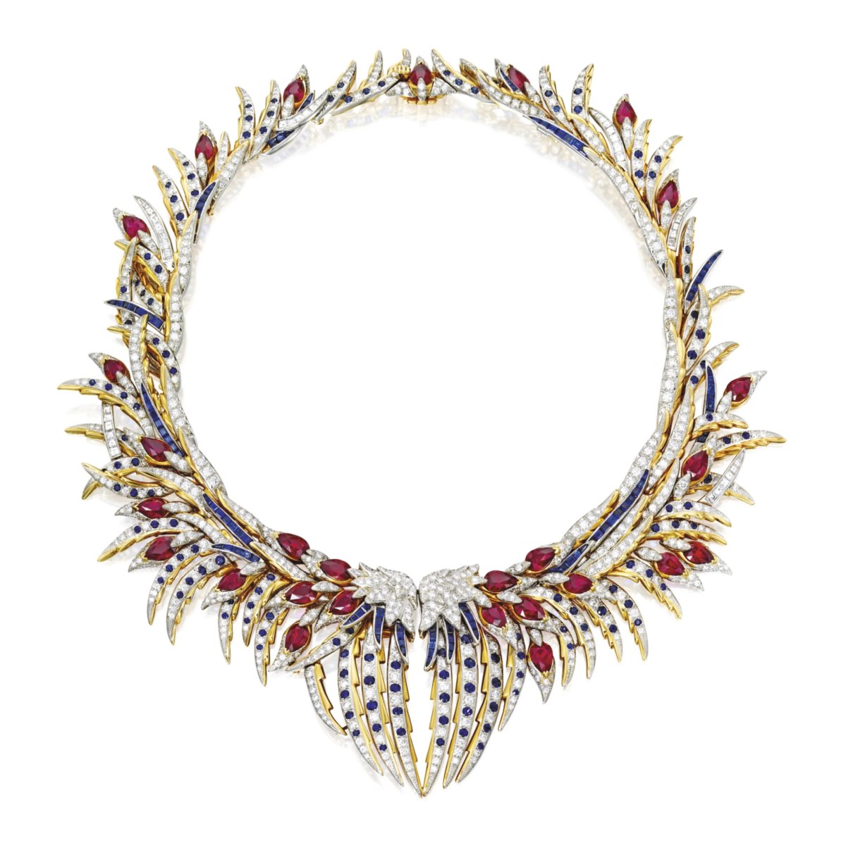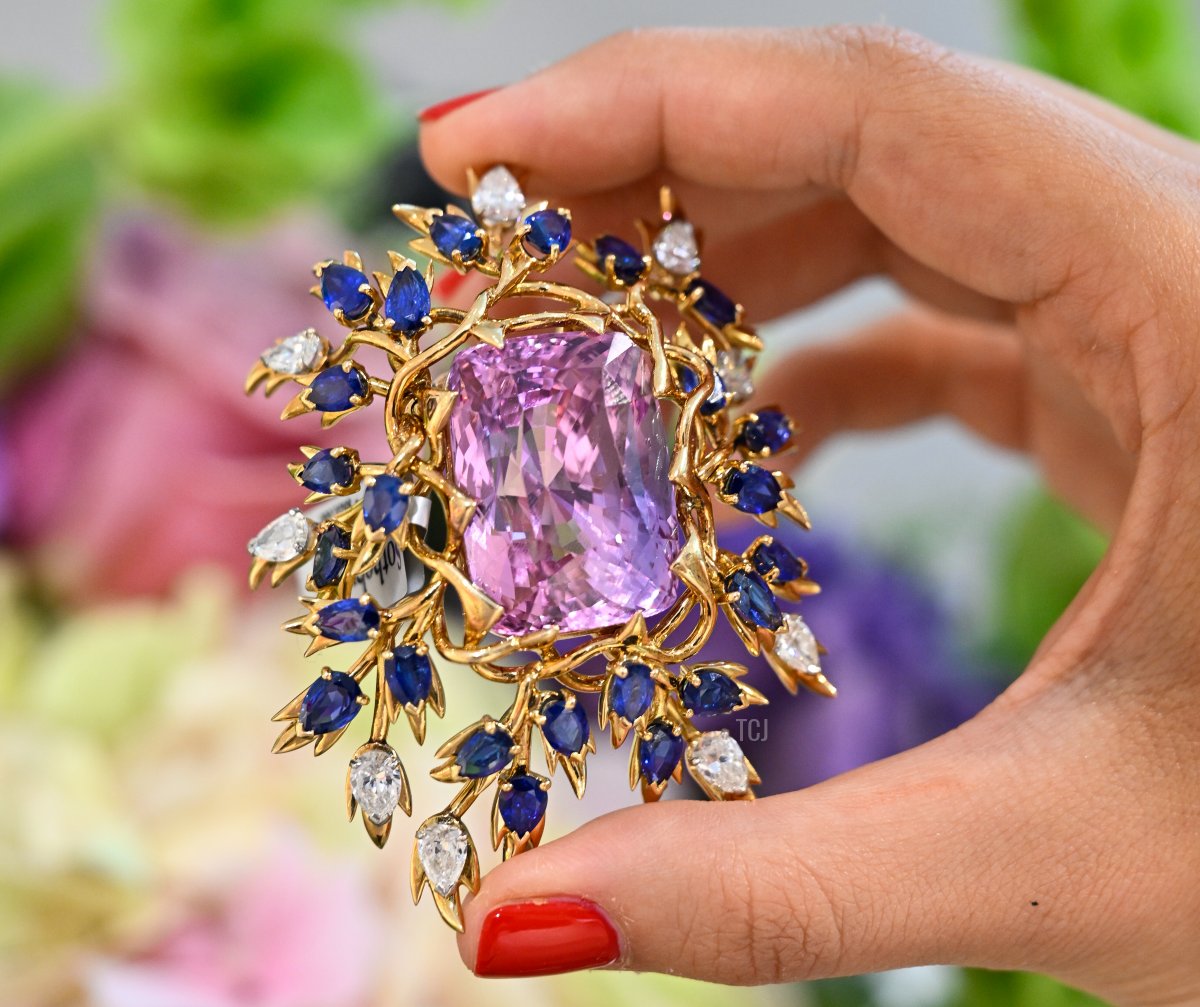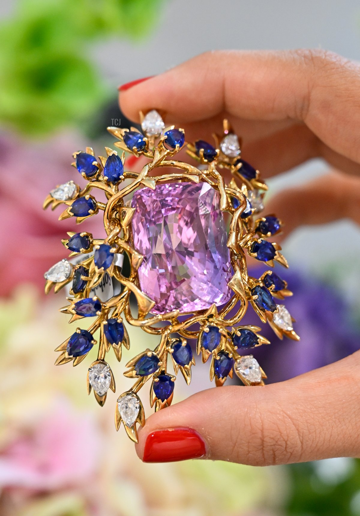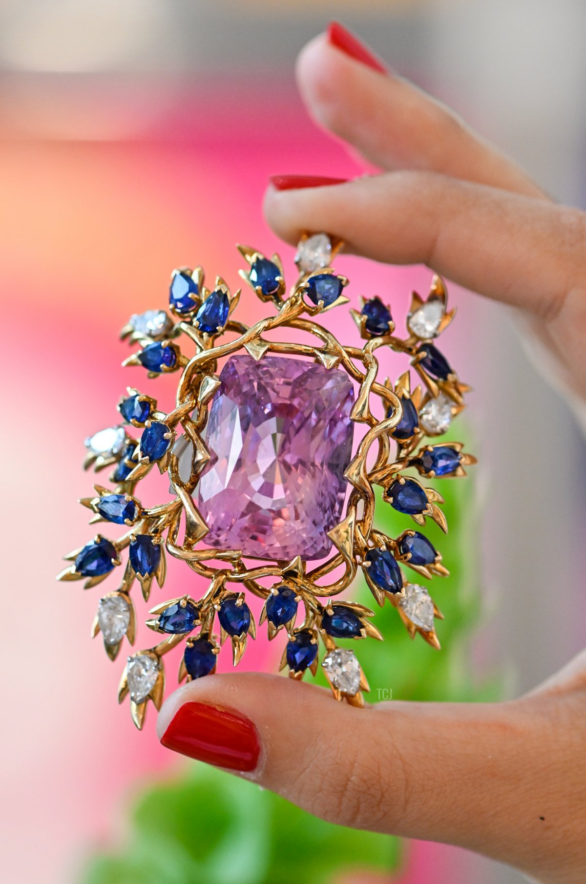 This spectacular midcentury brooch features a 92-carat pink sapphire surrounded by an abstract floral frame made of gold set with diamonds and blue sapphires. It was designed by Jean Schlumberger, the incredible mind behind so many iconic 20th-century Tiffany creations.