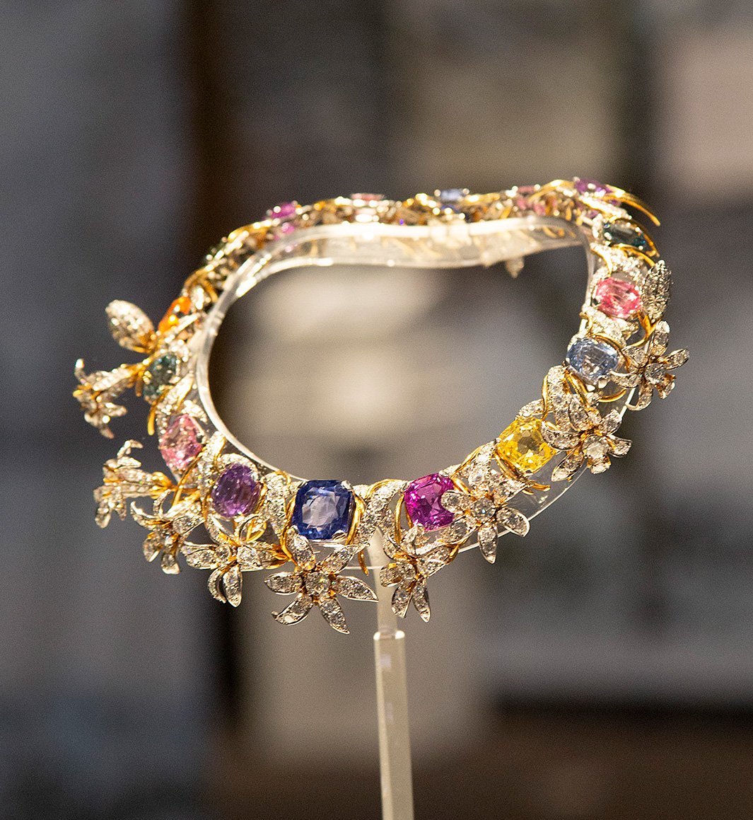 Another of my favorite Schlumberger creations is the remarkable Jasmine Necklace that he made for Bunny Mellon. That necklace features several multicolored sapphires. It’s displayed at the Virginia Museum of Fine Arts in Richmond, part of a spectacular gallery packed with jewels from the Mellon-Schlumberger collaboration. (I visited the gallery last year, and I can highly recommend it!)
