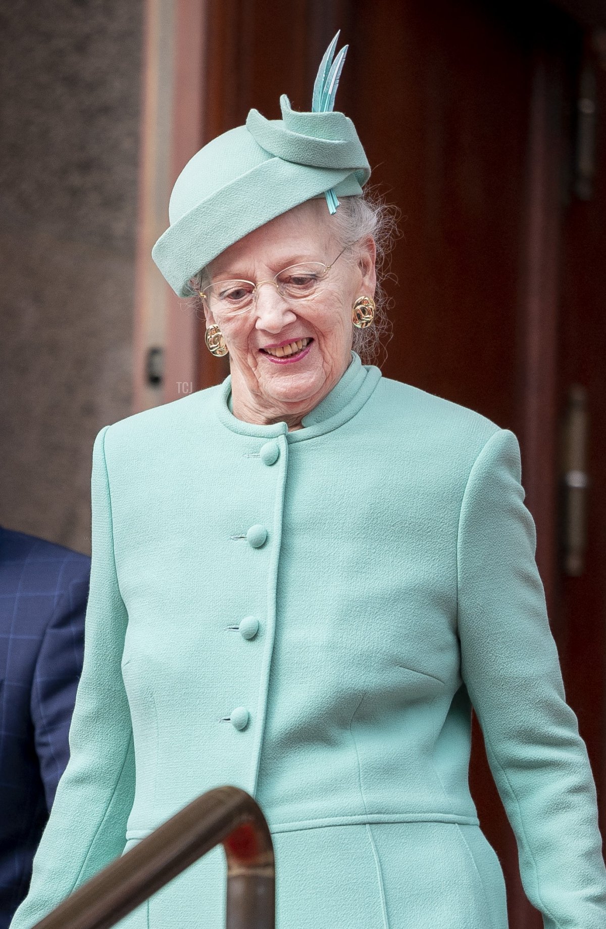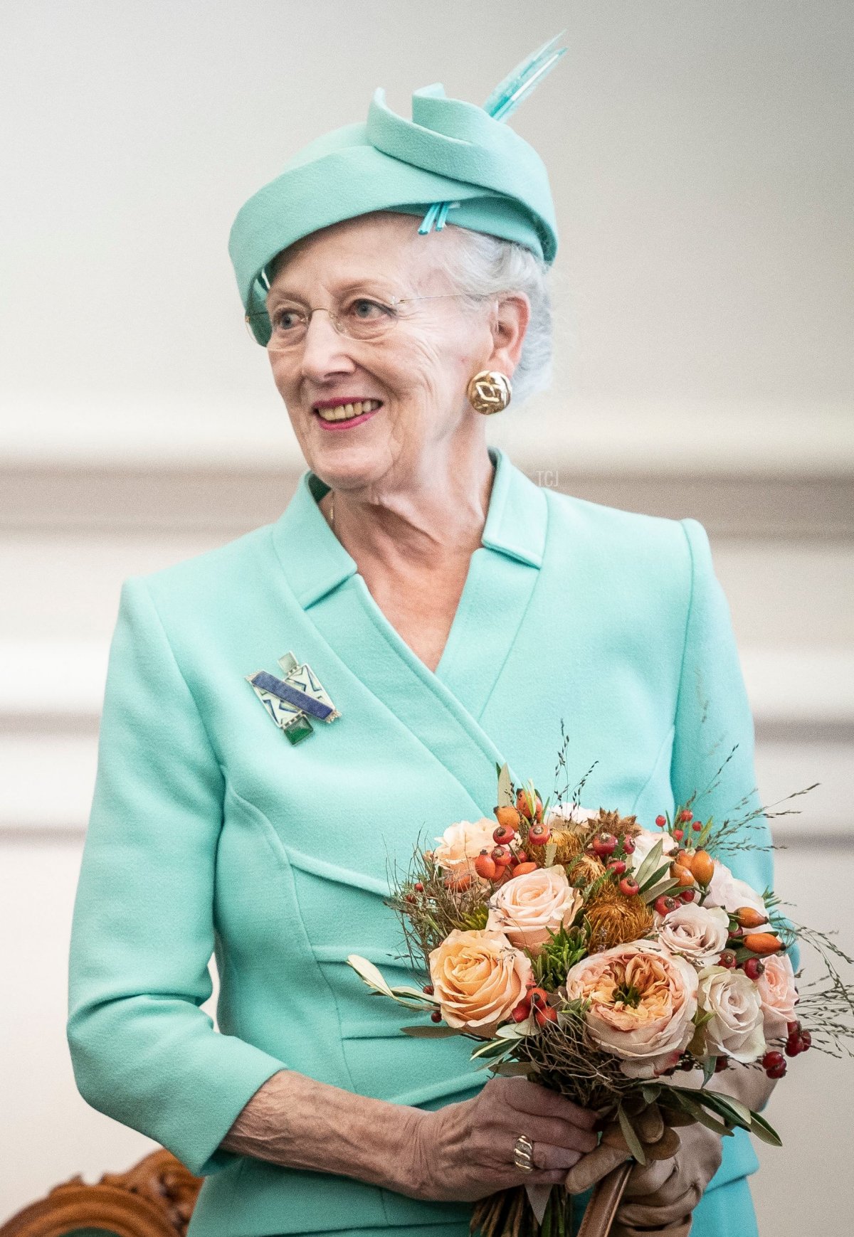 Queen Margrethe wore mint green for the event, accessorized with modern jewels. She chose gold earrings and a coordinating ring, as well as a very interesting brooch. The modern piece is a pastiche of various materials in different colors. I must admit that I don’t know anything about the provenance of this jewel, and I’d be grateful for more insights from anyone who does!