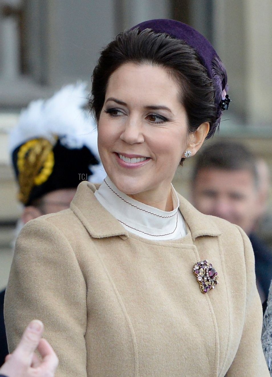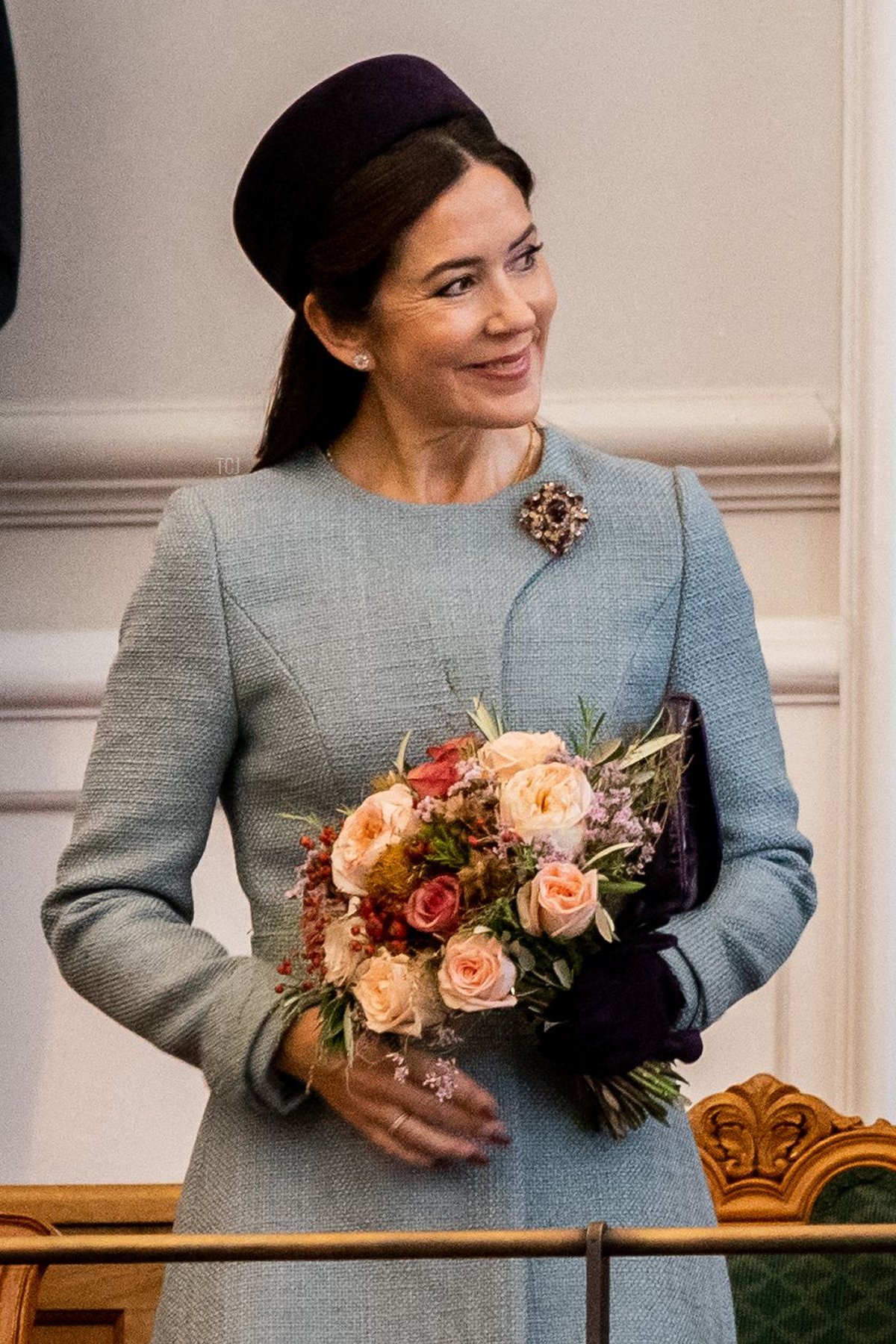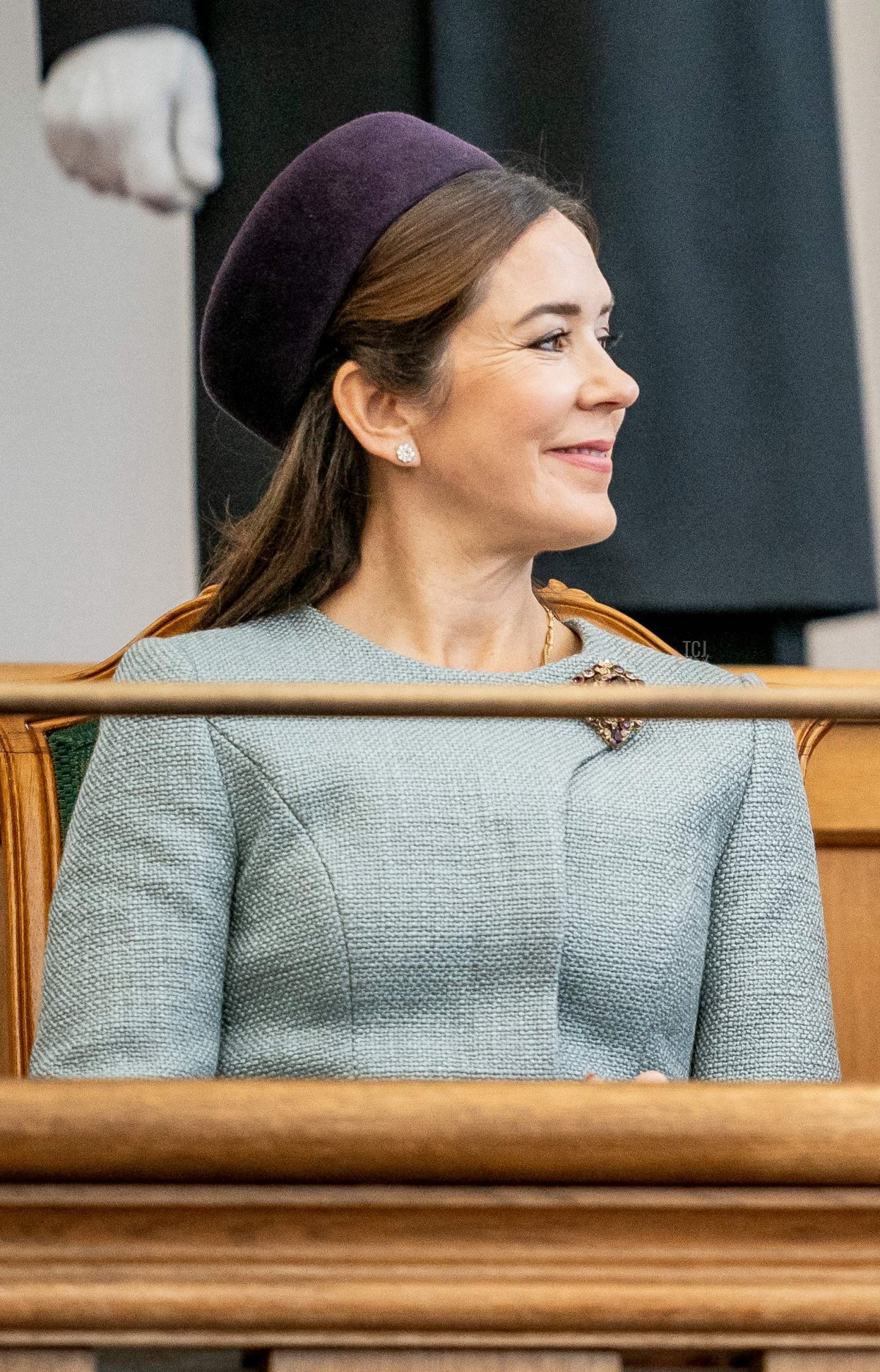Crown Princess Mary chose gray with a dark purple pillbox hat for the session opening. She picked up the purple color of the hat with her spotlight jewel: a brooch studded with various gemstones, including amethysts. Interestingly, this entire ensemble is a repeat from the opening of parliament in 2017, including the brooch used in exactly the same placement.