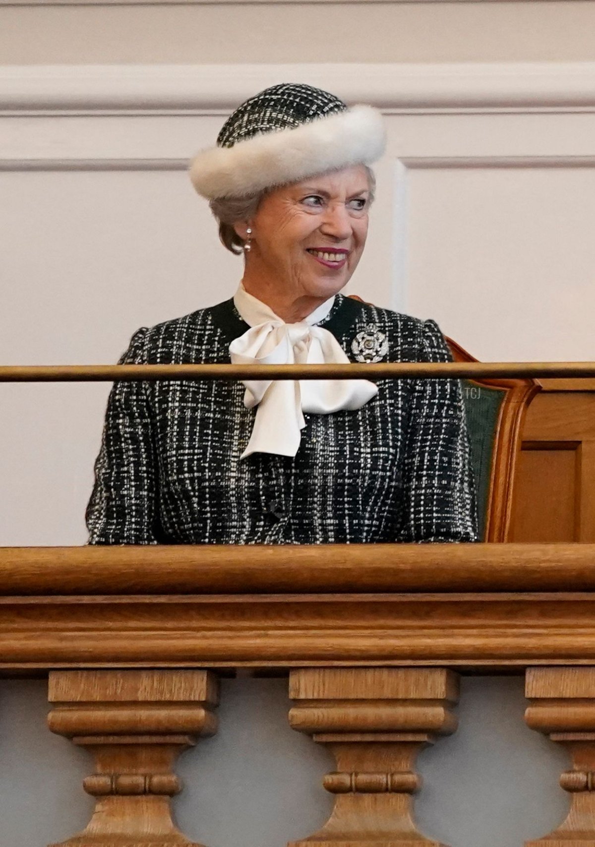 Princess Benedikte wore black and white tweed with a matching fur-trimmed hat for the event this year. She accessorized with pearl drop earrings and an interesting brooch. The piece appears to be a jeweled badge, complete with a small crown at the top.