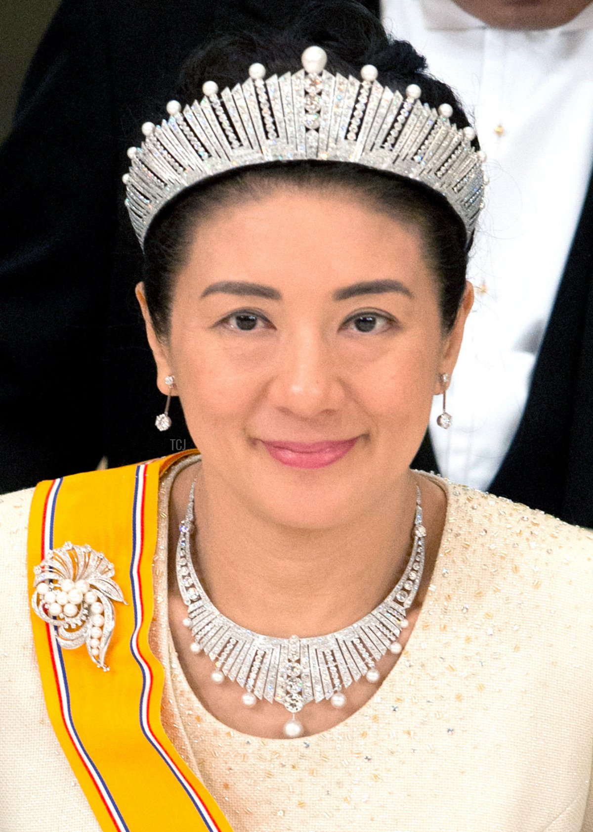 Here’s an excellent view of all of the pieces from the set, worn in October 2014 by Michiko’s daughter-in-law, Empress Masako, for a state dinner during the Dutch state visit to Japan. The suite has a bit of an Art Deco flair to its design.