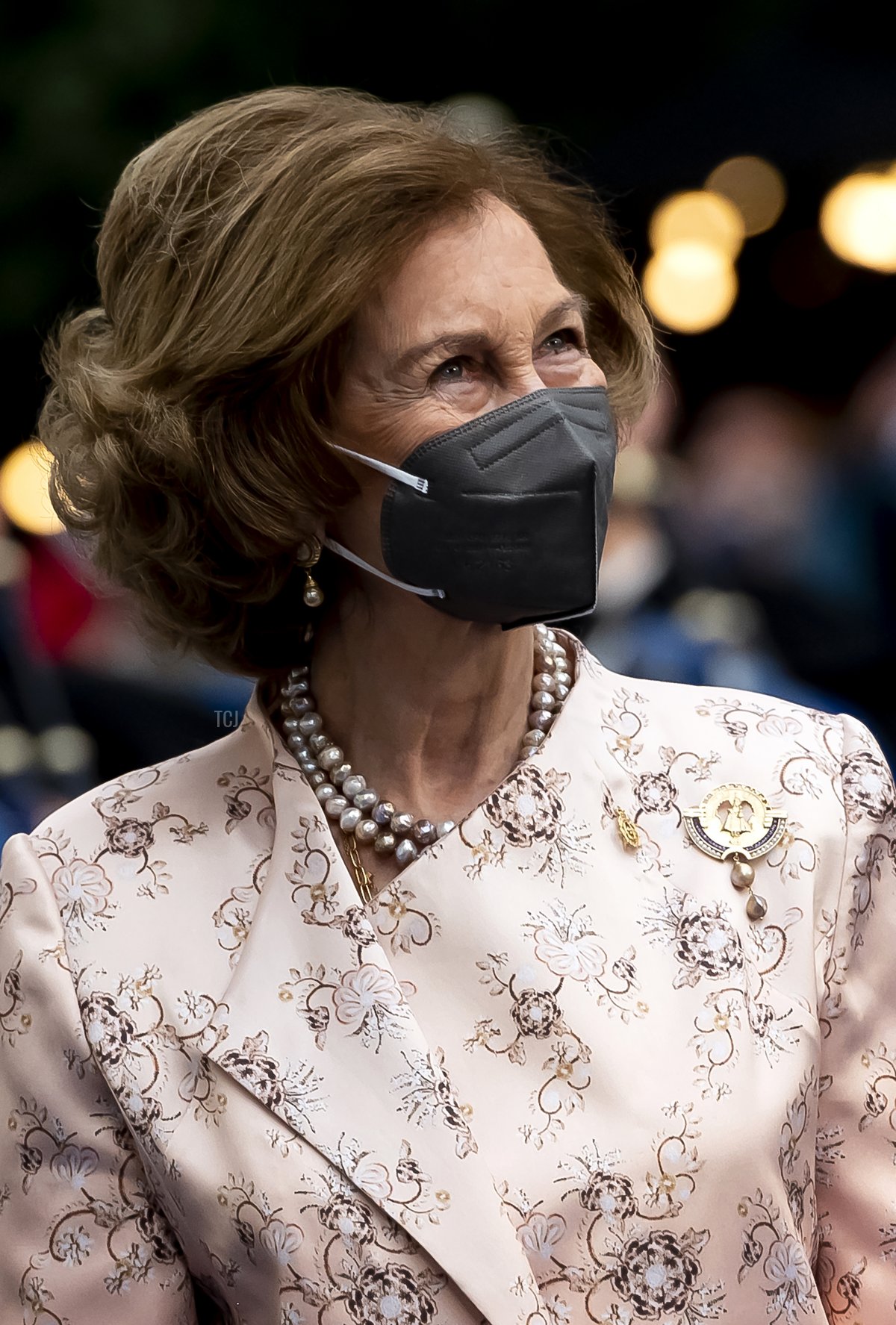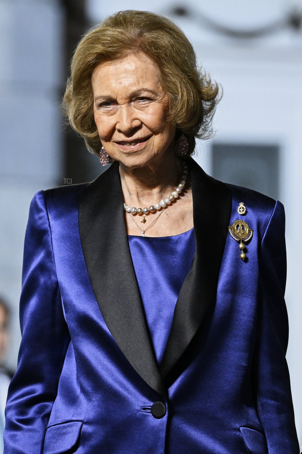 Queen Sofia was a proud grandmother in a blue satin suit for the awards ceremony, accessorized with her trademark collection of assorted bracelets, necklaces, rings, and brooches.