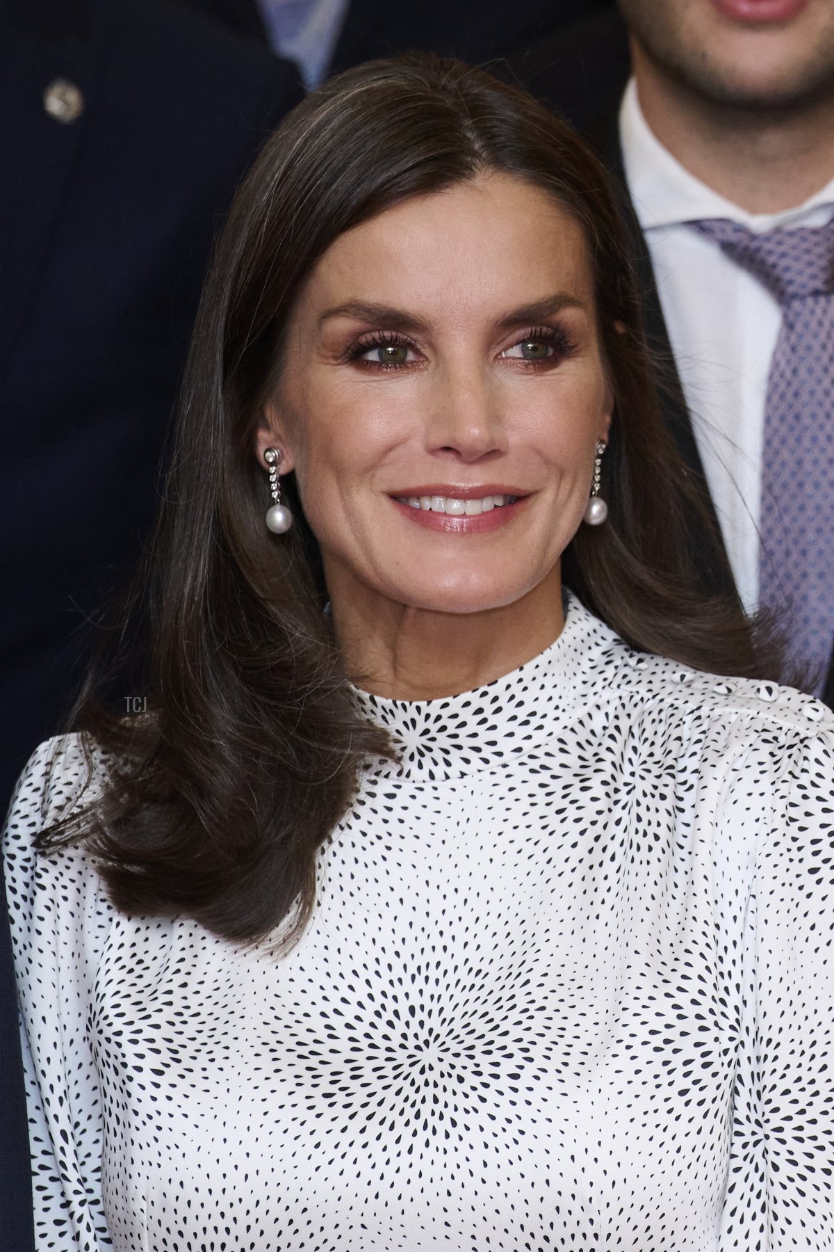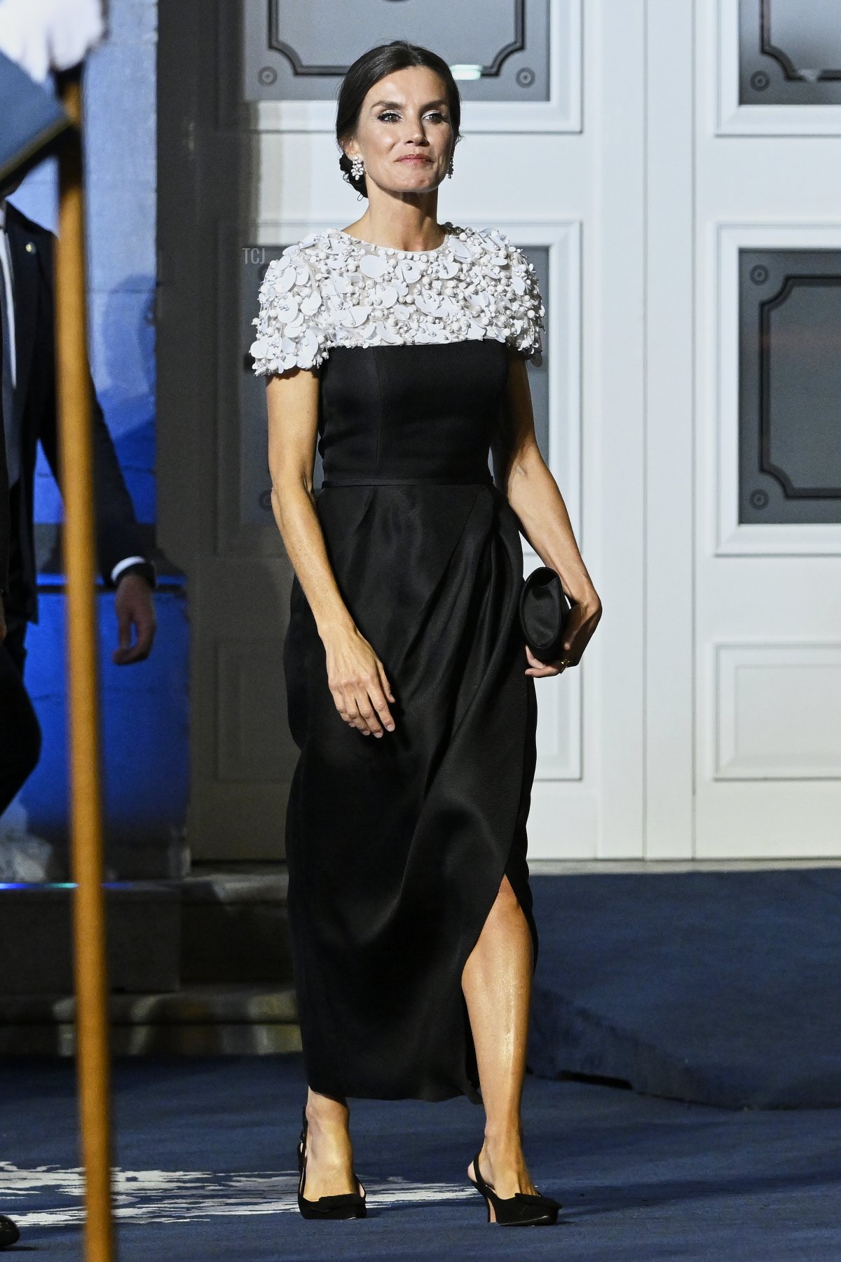 Queen Letizia chose black and white again for her ceremony outfit. Her dress features heavy white beading and sequin embellishments at the neckline.
