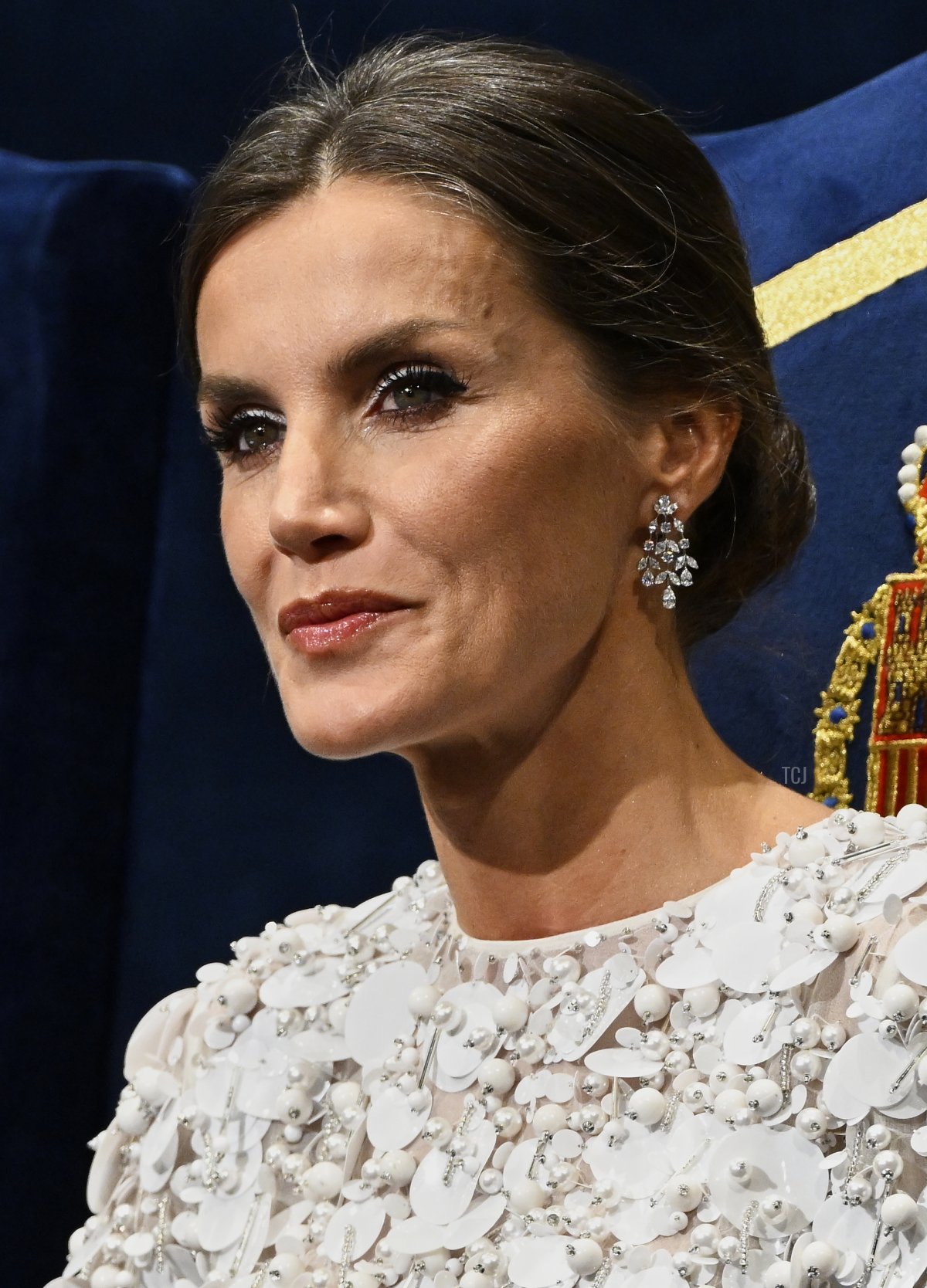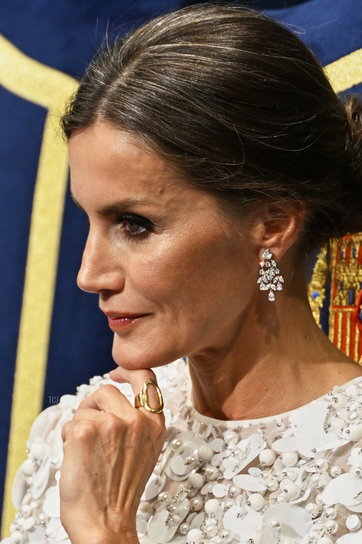 The earrings were a gift from the Emir of Qatar during his state visit to Spain in May 2022. She wears them here during the state dinner at the Royal Palace during the visit.