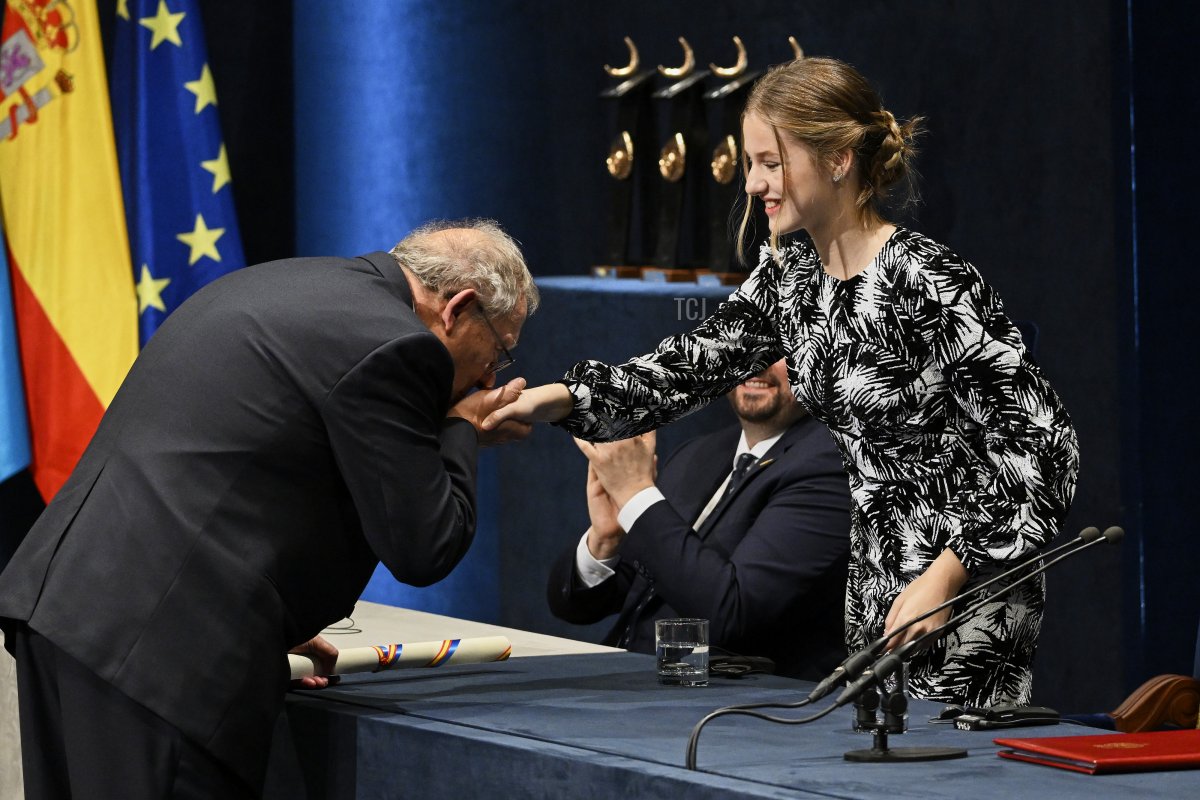 As Princess of Asturias, Leonor is front-and-center at the awards ceremony these days, delivering remarks and handing out prizes. Here, she’s greeted by Polish historian and journalist Adam Michnik, winner of this year’s communication and humanities award, during the ceremony.