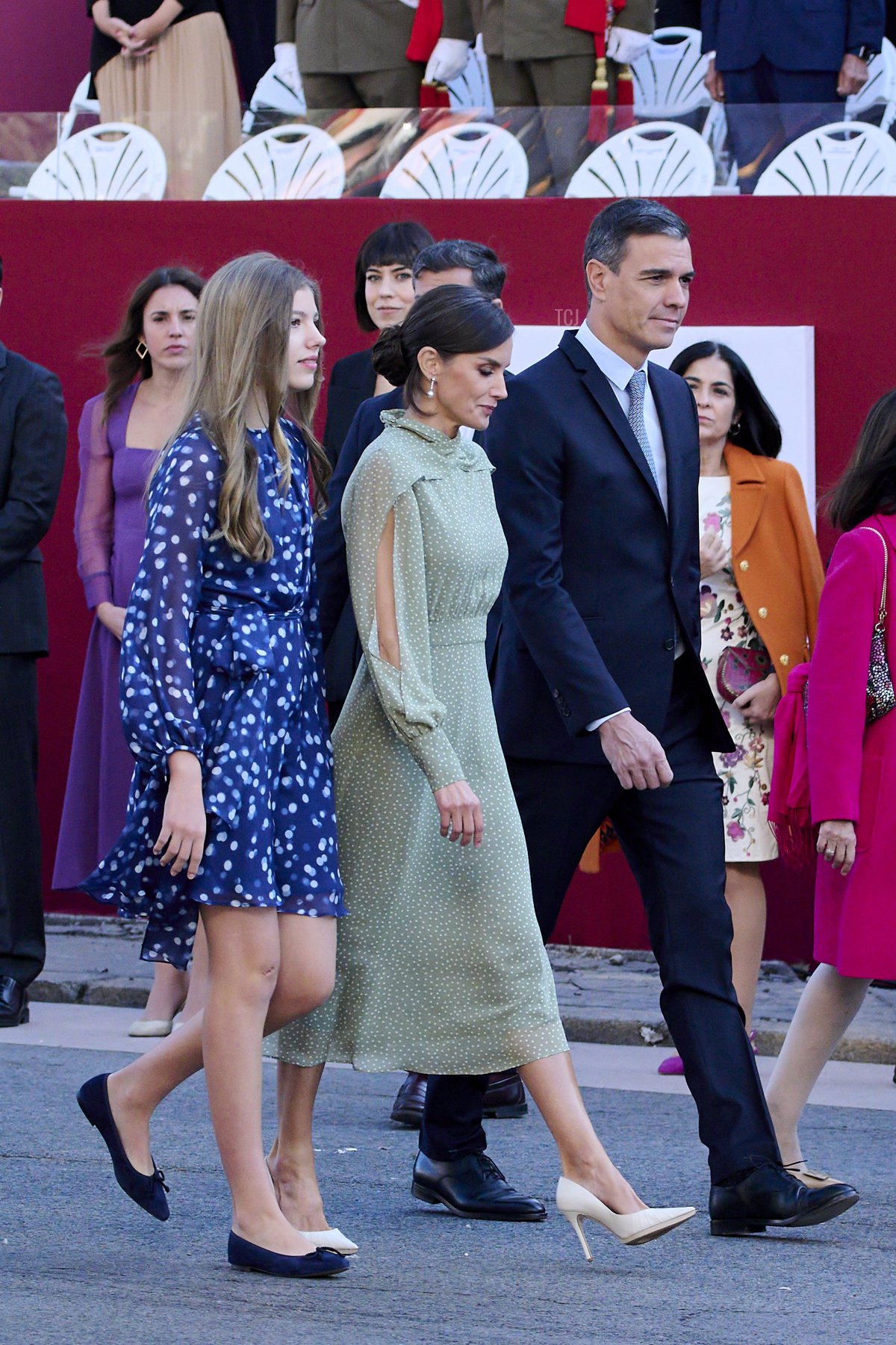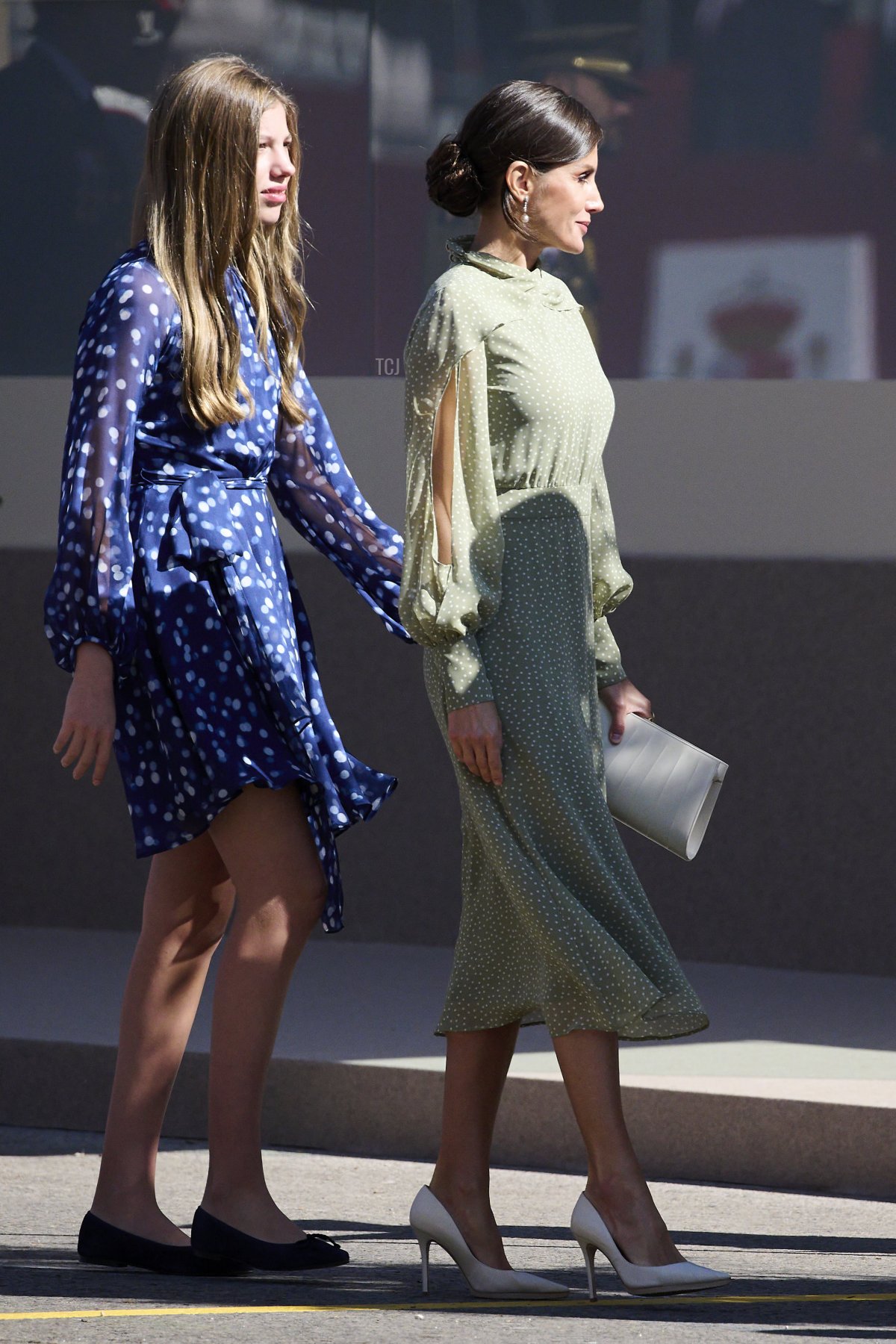 Both mother and daughter chose dresses with dotted prints for the parade. Queen Letizia opted for small ivory polka dots on a sage green background, while Infanta Sofia wore larger, more abstract dots on a blue dress.