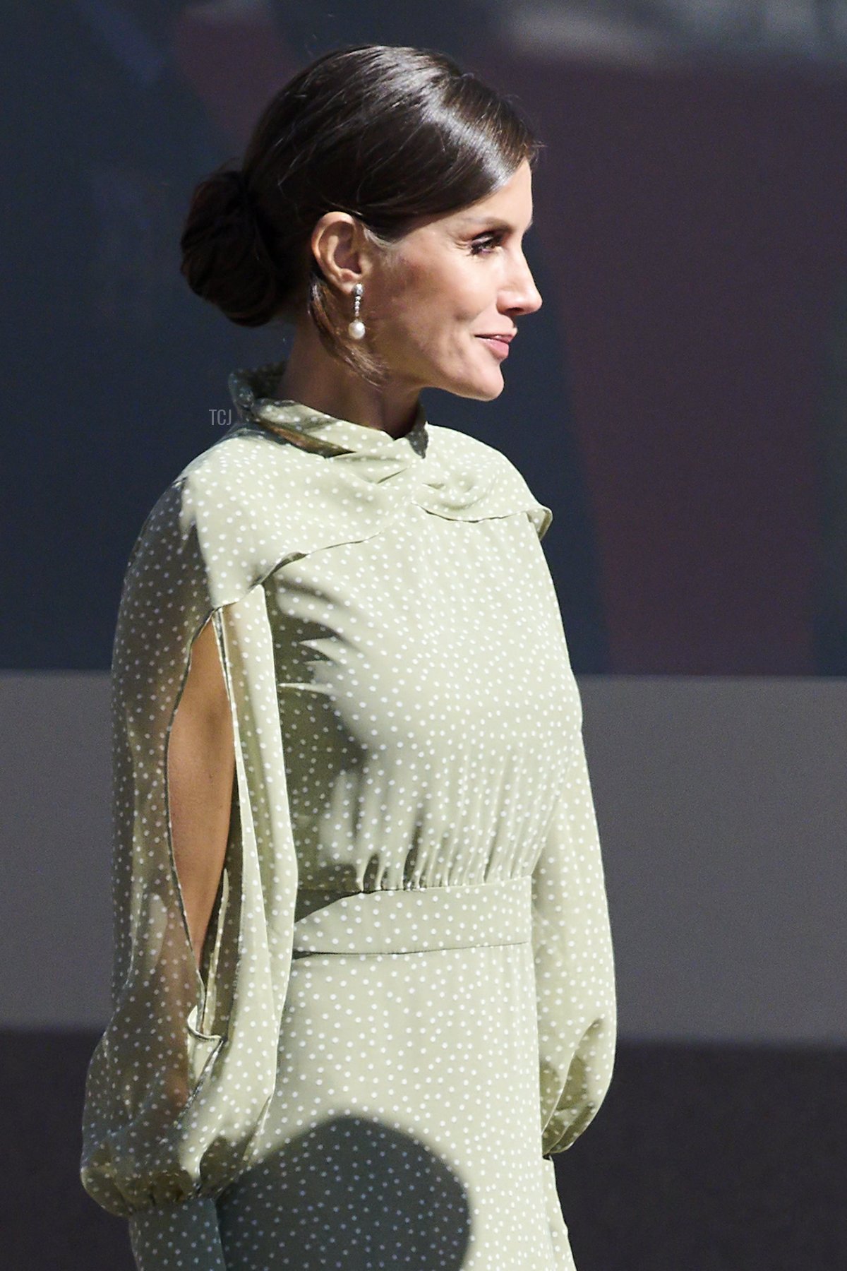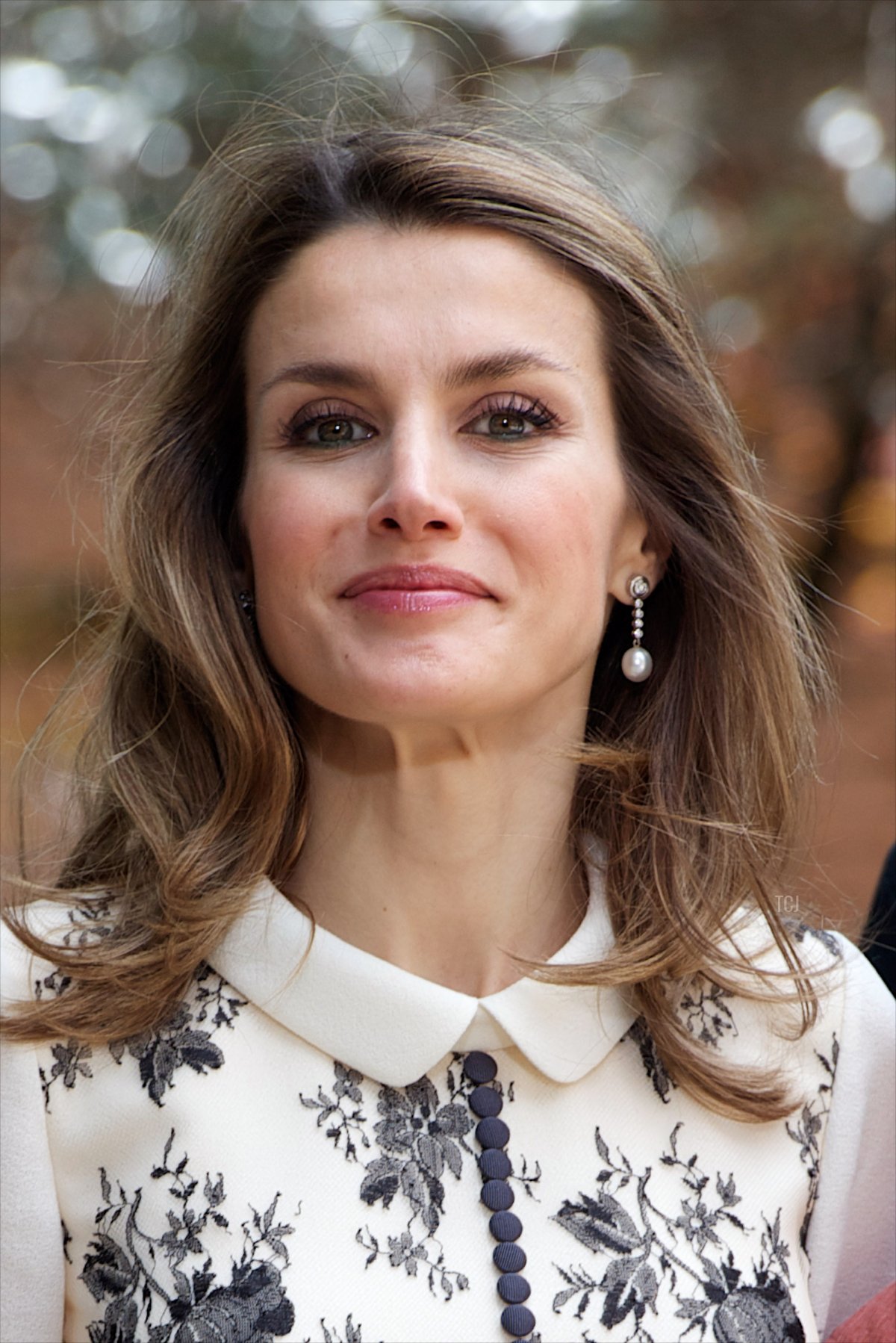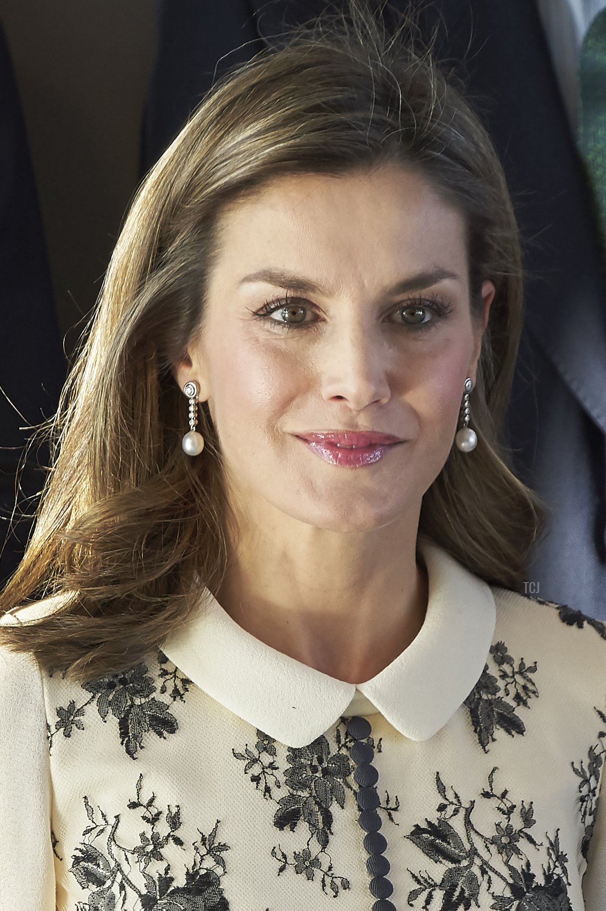 Letizia echoed the dots on her dress with her jewels, choosing a favorite pair of pearl drop earrings from her collection. The earrings feature bezel-set diamond studs and Australian pearl drops, and they’ve resided in her jewelry box for a very long time.