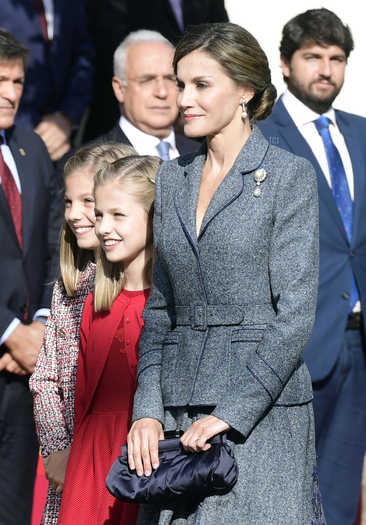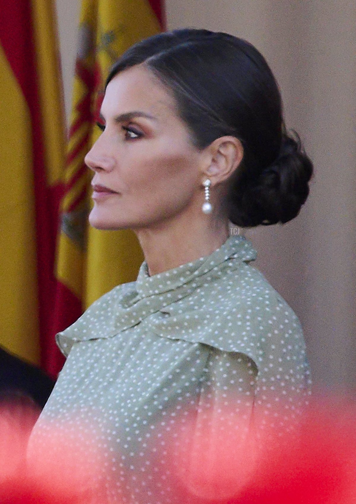 The Spanish royal family gathered in Madrid today for the annual National Day festivities, and Queen Letizia wore a favorite pair of pearl drop earrings for the occasion.