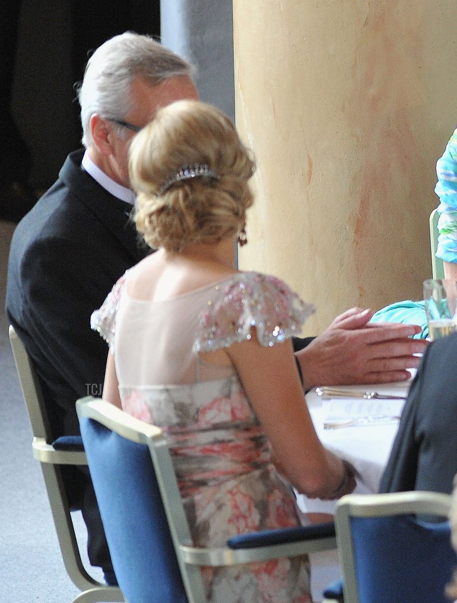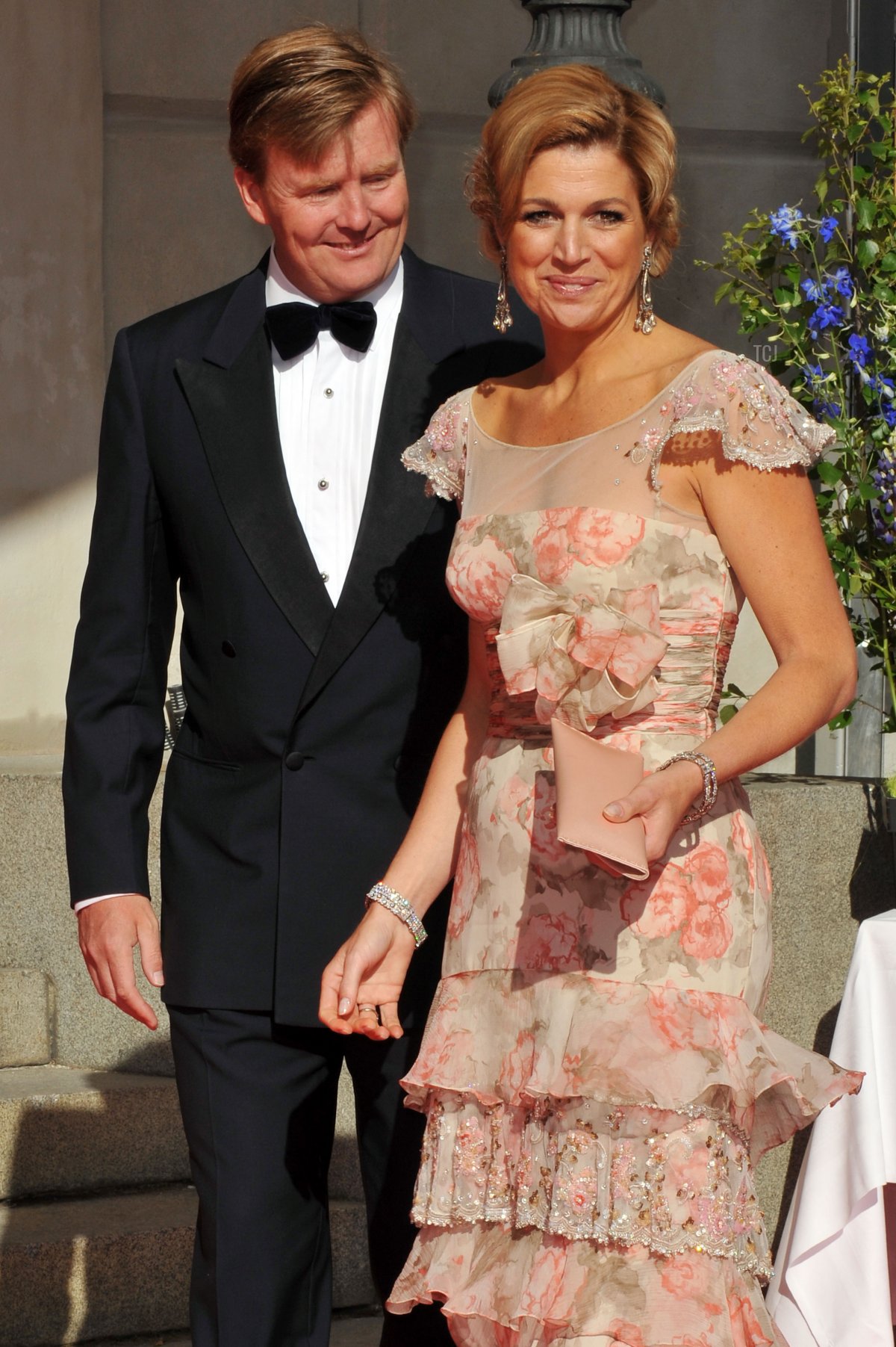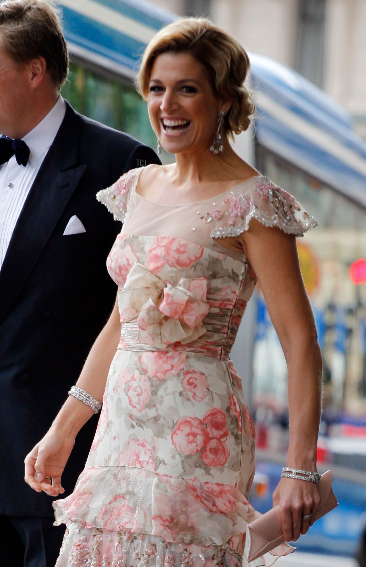 Prince Willem-Alexander and Princess Máxima, who were still a few years away from the throne, arrived at the Eric Ericson Hall in Stockholm for the pre-wedding dinner, which was followed by a concert. Máxima wore a festive floral gown with fluttery cap sleeves and a tiered skirt for the event. A little sparkle was added with beaded embellishment on the sleeves and skirt as well.