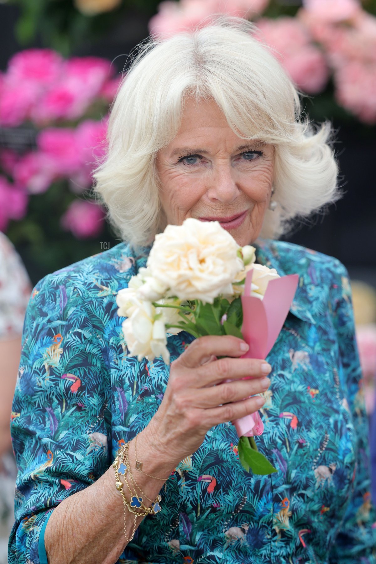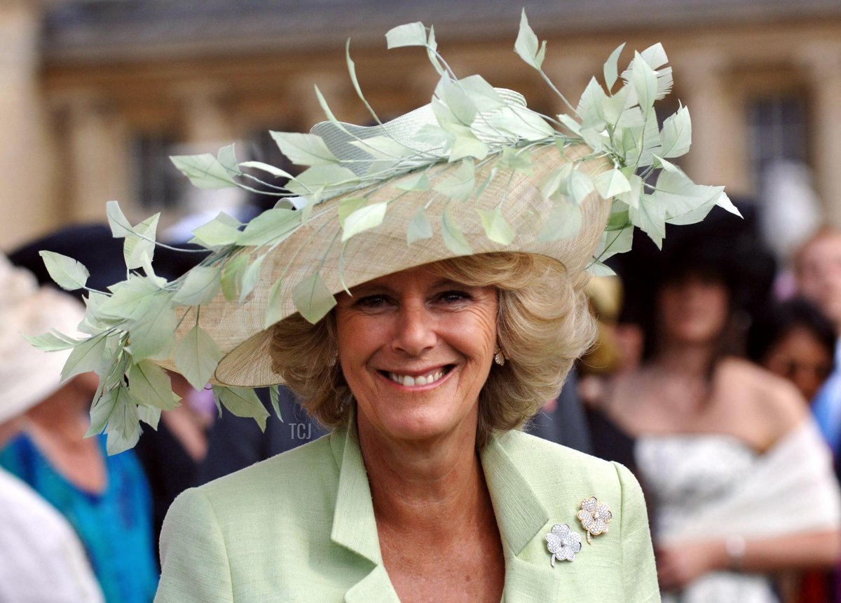 Camilla has been wearing and collecting Van Cleef & Arpels pieces for years. Here, she wears a pair of Cosmos clip brooches from the brand for her very first Buckingham Palace garden party in July 2005. One of the diamond brooches is set in yellow gold, and the other is set in white gold. You’ll note that she’s also wearing matching Cosmos earrings in this photograph.