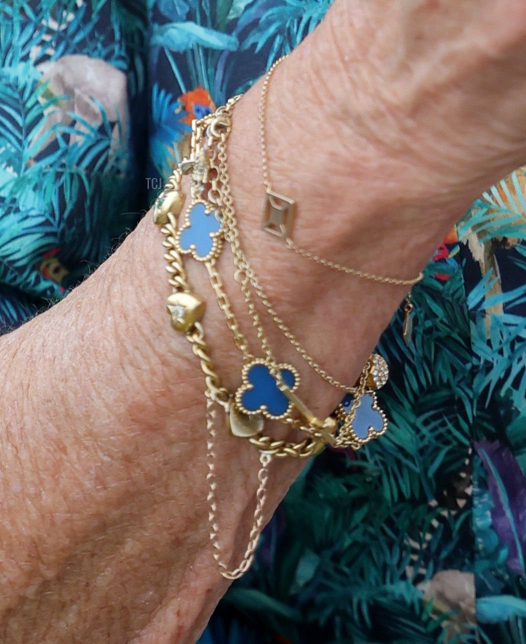 Here’s a closer look at the bracelet, worn with four additional gold bracelets of similar size and design, from this year’s Sandringham Flower Show. Whether the blue agate and gold Alhambra bracelet has particular sentimental meaning isn’t clear, but one thing’s for sure: Camilla absolutely loves to wear jewelry pieces from VC&A.