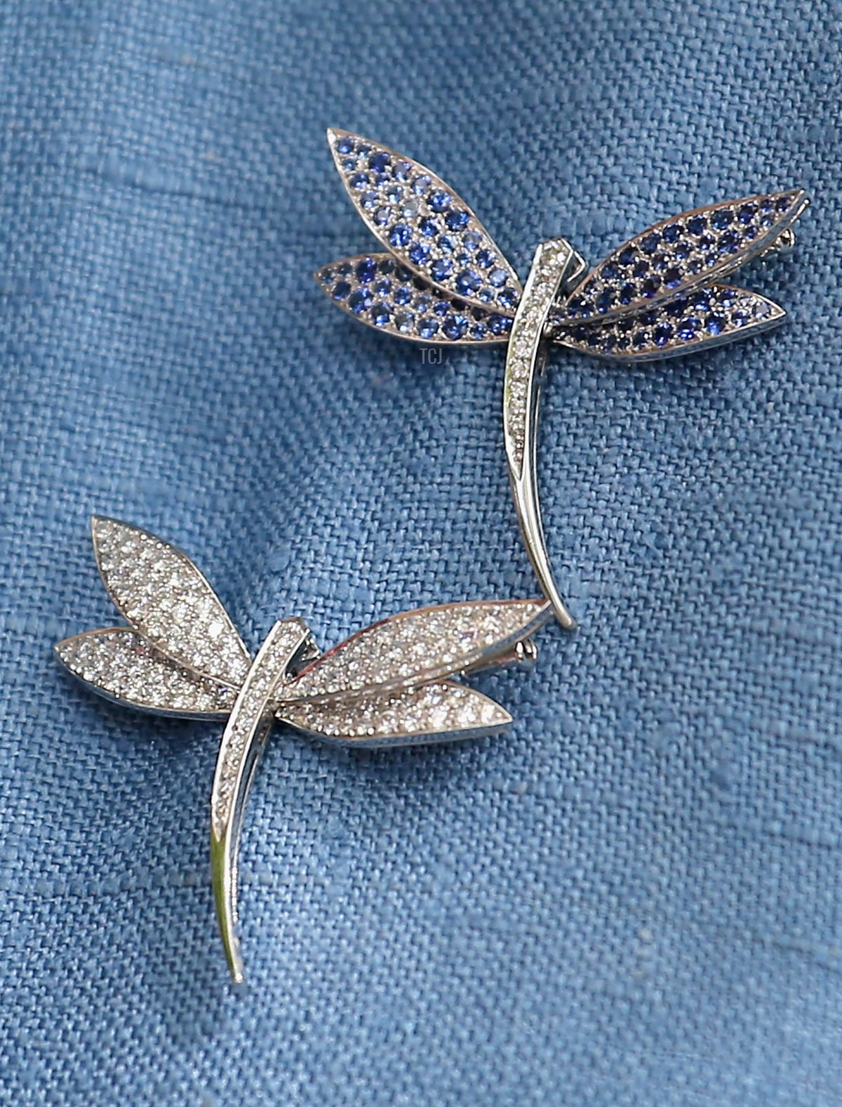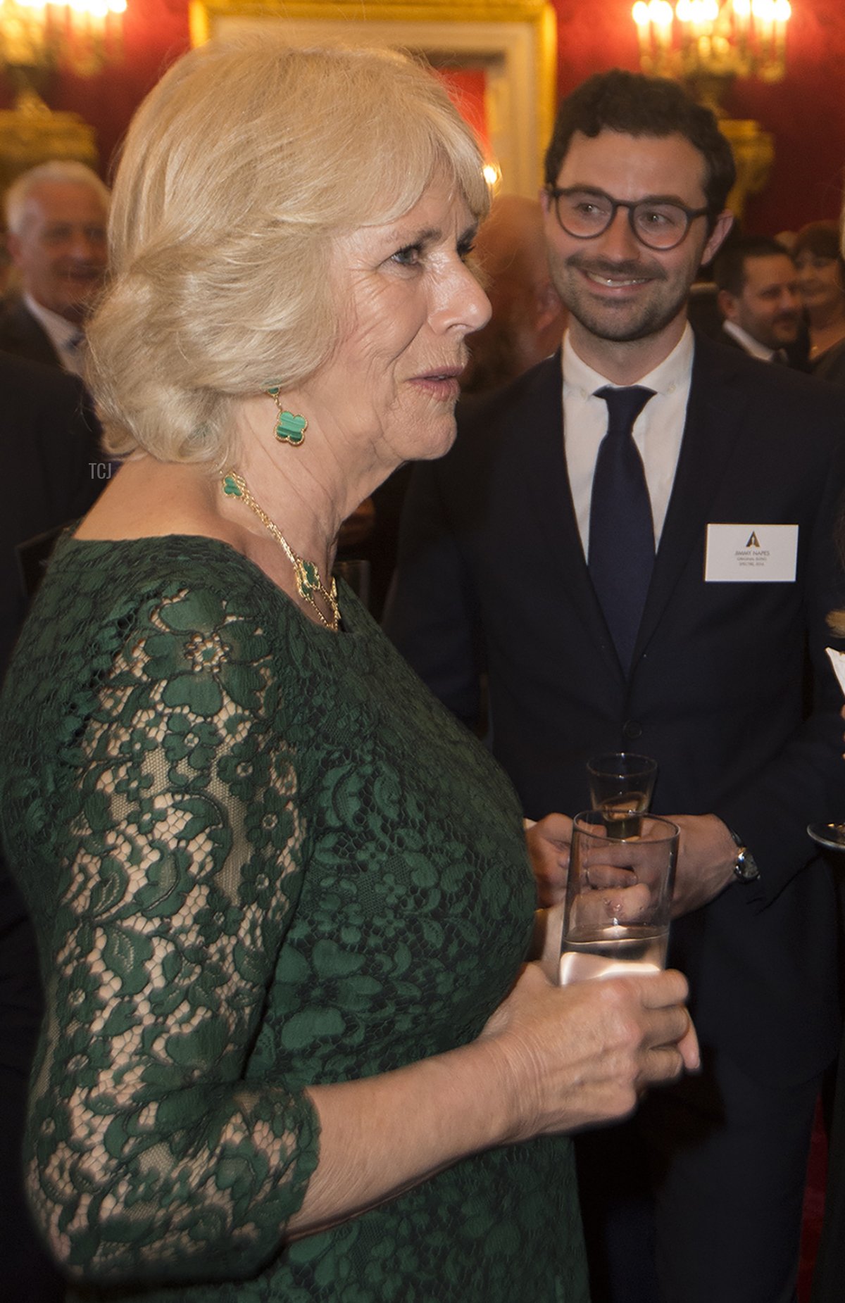 Camilla’s jewelry box also contains numerous other VC&A brooches. These are the firm’s Libellule dragonfly clip brooches, made of white gold set with diamonds and sapphires. Camilla wears them here in February 2017 for the launch of the Great Get Together at Clarence House.