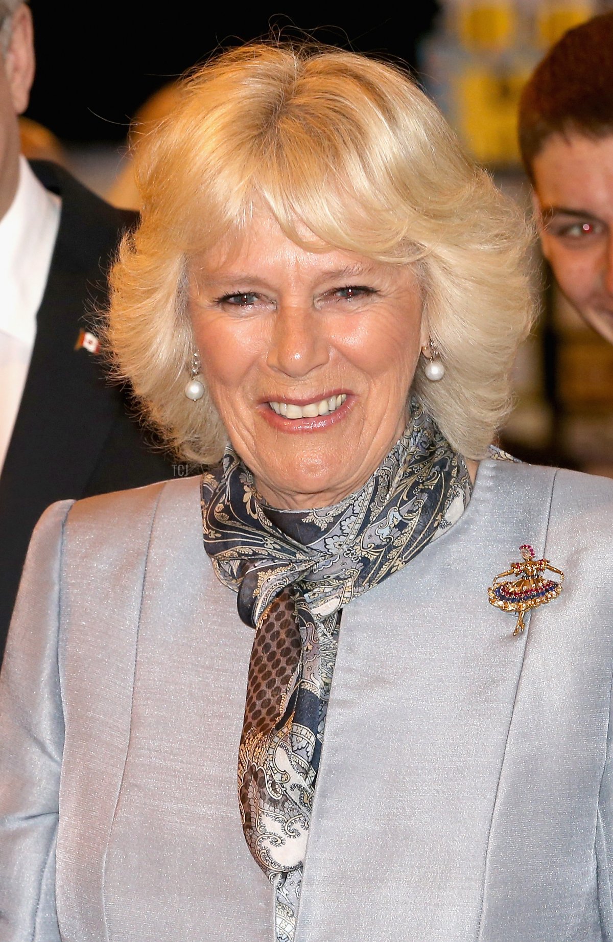 Queen Camilla also owns a ballerina brooch from Van Cleef & Arpels. The original vintage brooches were made in the 1940s, part of a collaboration between Claude Arpels and George Balanchine. The design style was revived by the jeweler in 2007. Camilla wears her ballerina brooch here in Winnipeg in 2014.