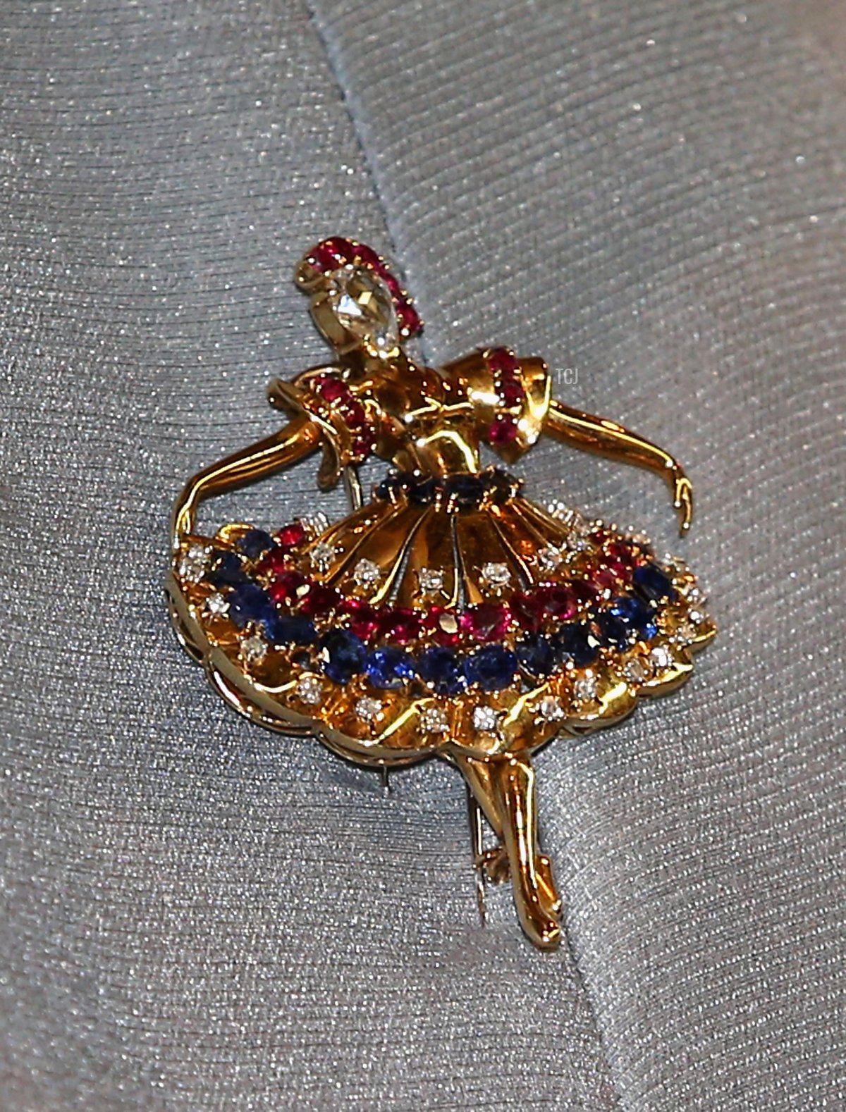 Here’s a closer look at the gold brooch, which is set with diamonds, rubies, and sapphires.