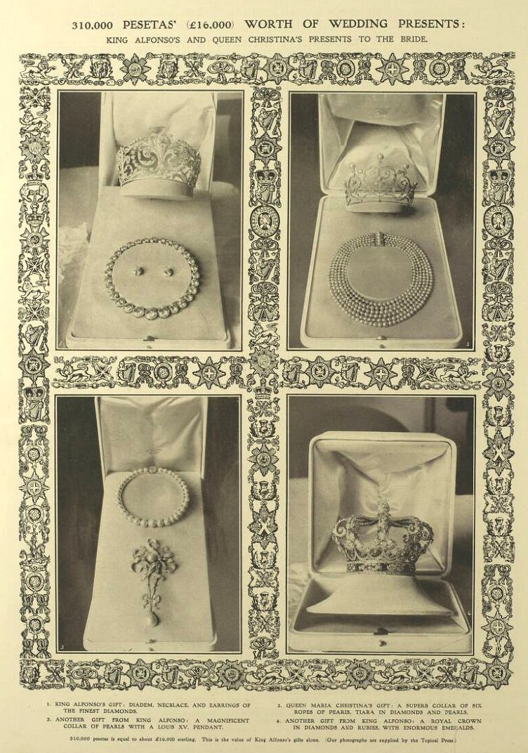 The queen-to-be was greeted at the Royal Palace in Madrid by a treasure trove of wedding presents, including a collection of jewelry that was definitely fit for a queen. Bejeweled gifts had arrived from the bride’s mother, her aunt and uncle, and her future mother-in-law, but it was Alfonso who gave her the greatest cache of jewels. He presented her with an actual crown, as well as necklaces of pearls and diamonds, earrings, and brooches. The star piece of jewelry, however, was a grand diamond tiara, featuring the symbol of the House of Borbón, the fleur-de-lis, rendered in brilliant gems. It’s pictured in its case in the top left of the image above. The diadem had been made by Ansorena, the famed court jeweler of the Spanish royal family. The tiara would be nicknamed “La Buena,” which means the “good one.”