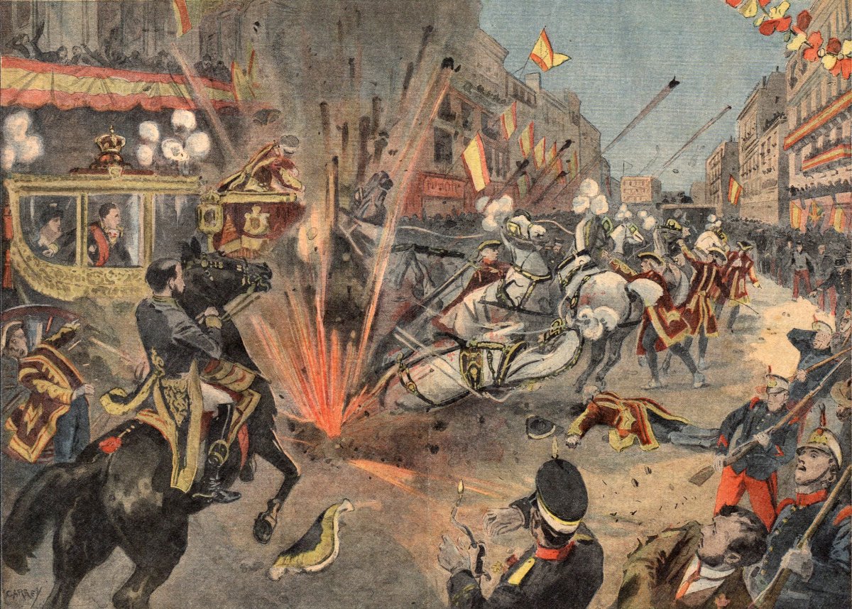 Well-wishers shouted congratulations to the couple from the street and from the windows and balconies of buildings along the route as the carriages made their way back to the Royal Palace. The procession had made its way along the Calle Mayor, one of Madrid’s main thoroughfares, and had nearly reached the palace complex when, suddenly, a single bouquet of flowers floated down from the third-floor balcony of Number 88, a building of flats beside the Italian embassy. And then, the street exploded into chaos: first, a blinding flash of light, and then a reverberating crash of sound. Fragments of metal and clouds of smoke and debris enveloped the procession, and the carriages teetered as the horses panicked in the melee.
