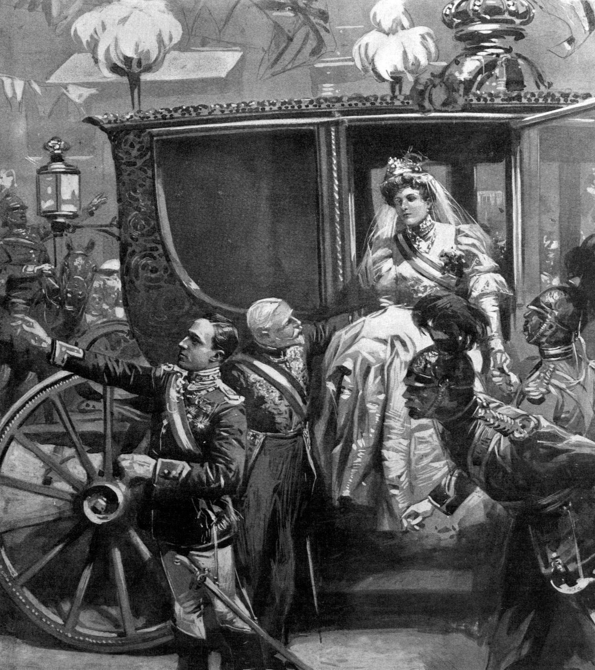 King Alfonso XIII was waiting at the church for his bride, also attired in his finest clothing, including white satin breeches and special gold spurs. The bridal procession took its time to arrive at the church, chosen as the location for the ceremony in part because it provided a lengthy five-mile carriage route along which the people of Madrid could gather to see the new Queen of Spain on her wedding day. It was a warm day, and all along the route, people cheered mightily as the princess waved from her carriage—though, based on a recommendation from security officials, they were asked not to throw flowers at the carriages as they drove past. Alfonso grew antsy and sent a message asking the procession to pick up the pace, but he still waited at the church for an entire hour for his bride to arrive.
