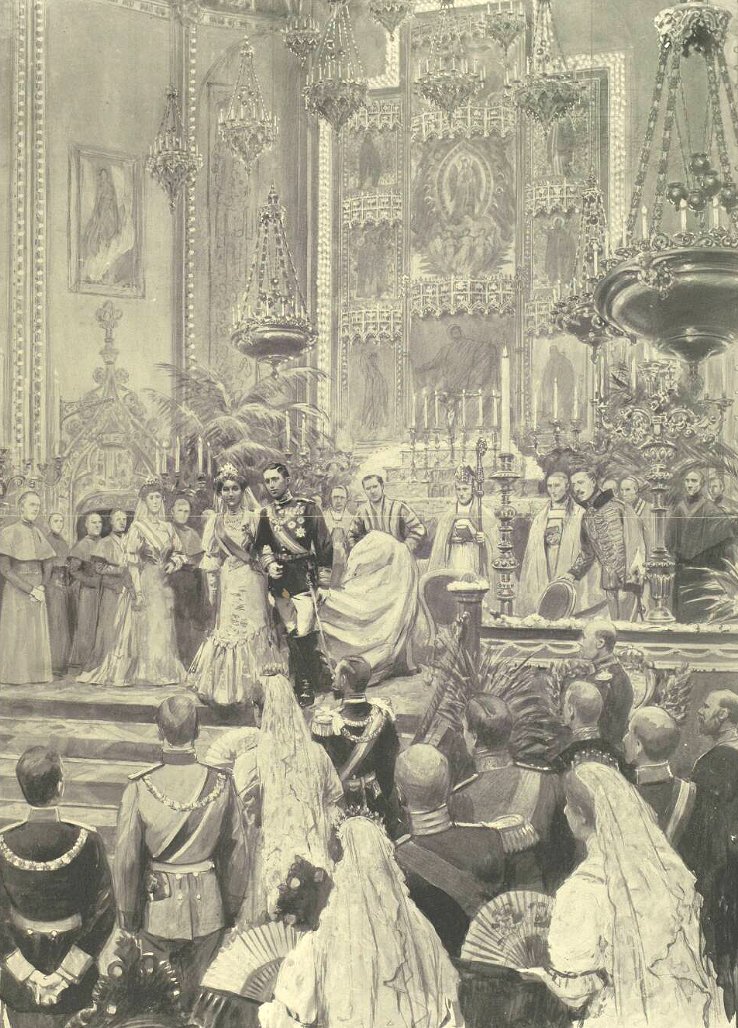 When she stepped out of the carriage, gleaming in white and sparkling in diamonds and pearls, Ena would have been an impressive sight. The other royal ladies in attendance—including the Princess of Wales (Queen Mary), the Duchess of Saxe-Coburg and Gotha, and Grand Duchess Vladimir of Russia—were also wearing tiaras, adding to the grandeur of the scene. Inside the church, the wedding ceremony proceeded flawlessly. A choir of 200 sang voices sang hymns as the royals stood before an altar decorated with candles and roses. The Archbishop of Toledo, Cardinal Sancha, pronounced the couple married, and transformed Her Royal Highness Princess Victoria Eugenie of Battenberg into Her Majesty The Queen of Spain in the process.