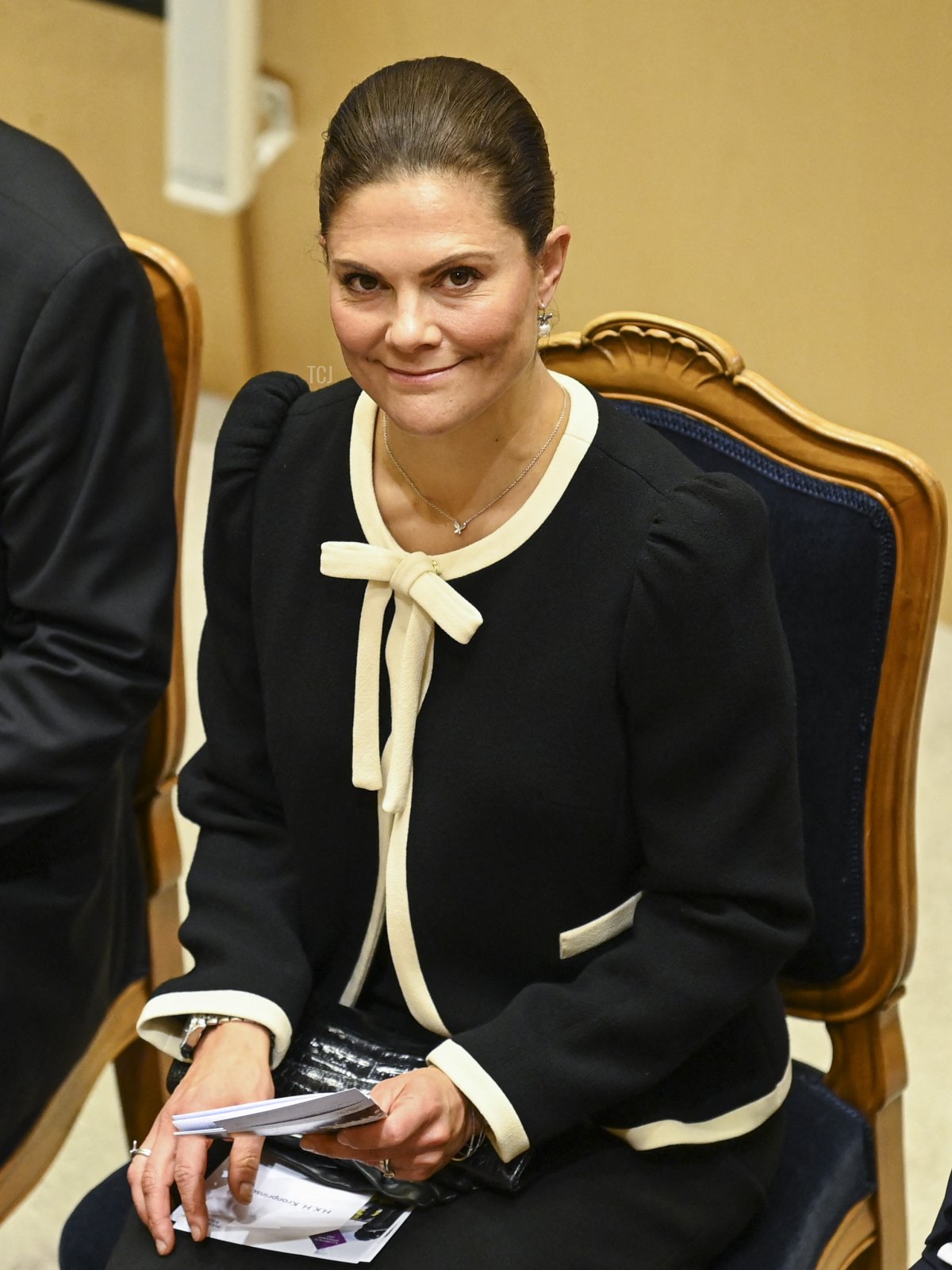 With her black and white outfit, Crown Princess Victoria wore a suite of delicate jewelry that she’s owned for more than a decade. The white gold and pearl pieces come from one of her favorite jewelry brands, Kreuger. The set features a necklace and matching earrings, and I believe I spot a matching ring on her right hand, too.