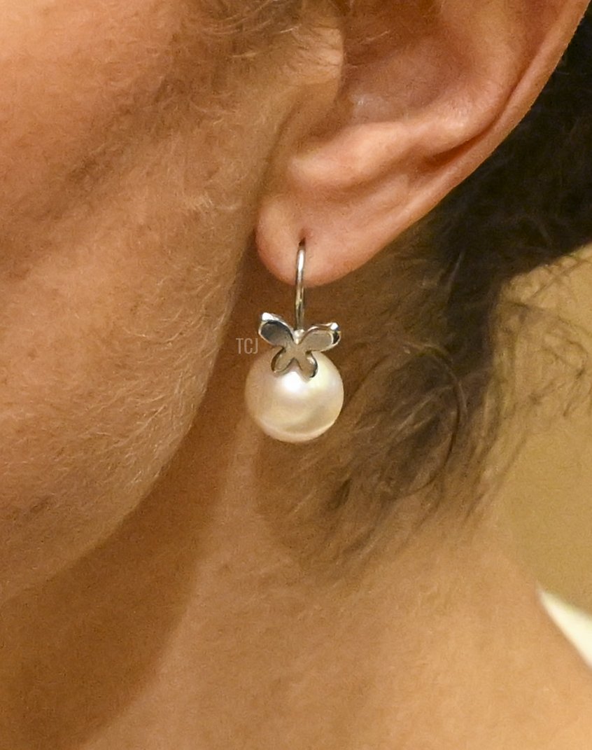 She added a bit of sparkle to her ensemble with a pair of diamond drop earrings.