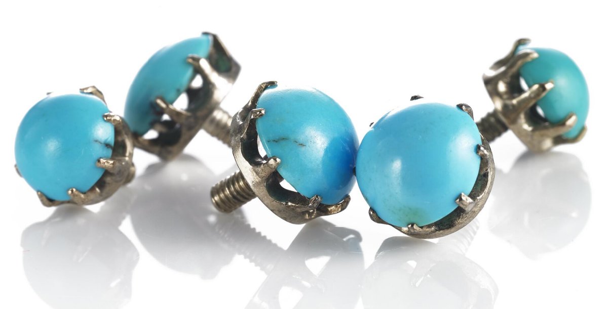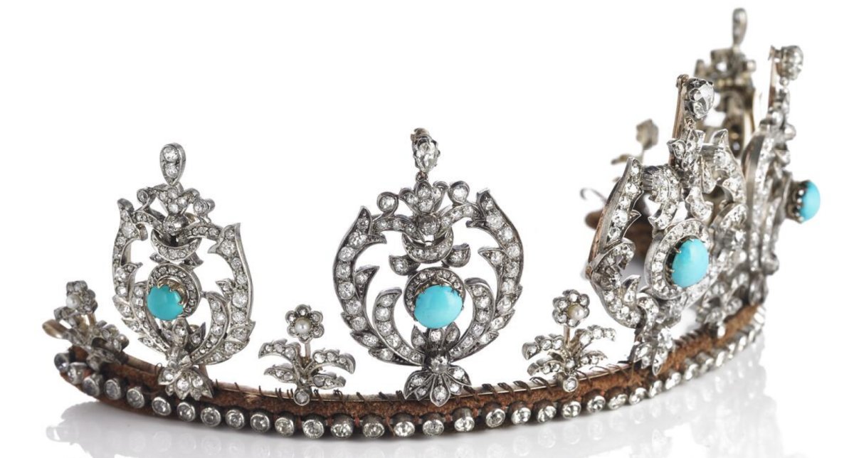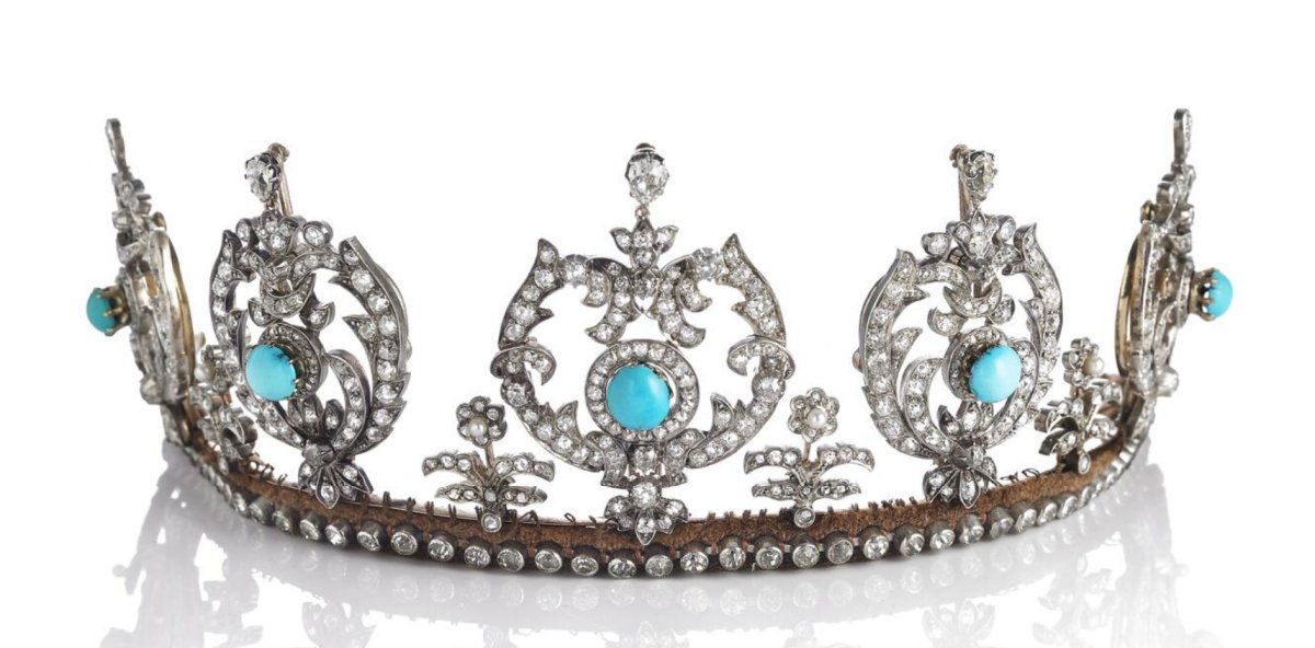 The jewel is set with diamonds, pearls, and two sets of removable ornaments (one sapphire, one turquoise). We’re all most familiar with the tiara in its sapphire setting. The lot notes continue the description of the tiara in detail: “Designed with five upright, foliated and scrolling heart-shaped ornaments, decreasing size from the middle to each side, respectively set with cabochon natural sapphires at the center encircled by numerous rose-cut diamonds, the ornaments adorned with old mine, rose and single-cut diamonds, upper parts with stylized floral and buds including the centered three ornaments with pear-shaped old mine-cut diamonds, the two latter upper parts with two old mine-cut diamonds formed as a pear, lower parts with stylized floral, in between and to the back with minor foliated flowers, set with rose-cut diamonds and presumably natural pearls, mounted in 14k gold, rose gold and silver on a curved circlet base.”