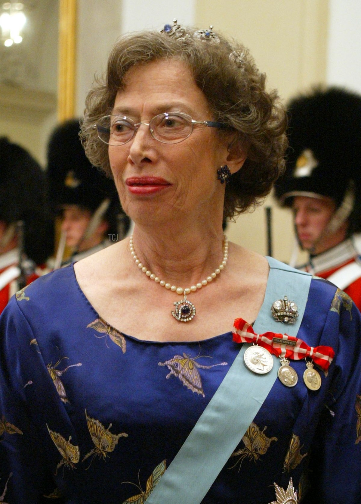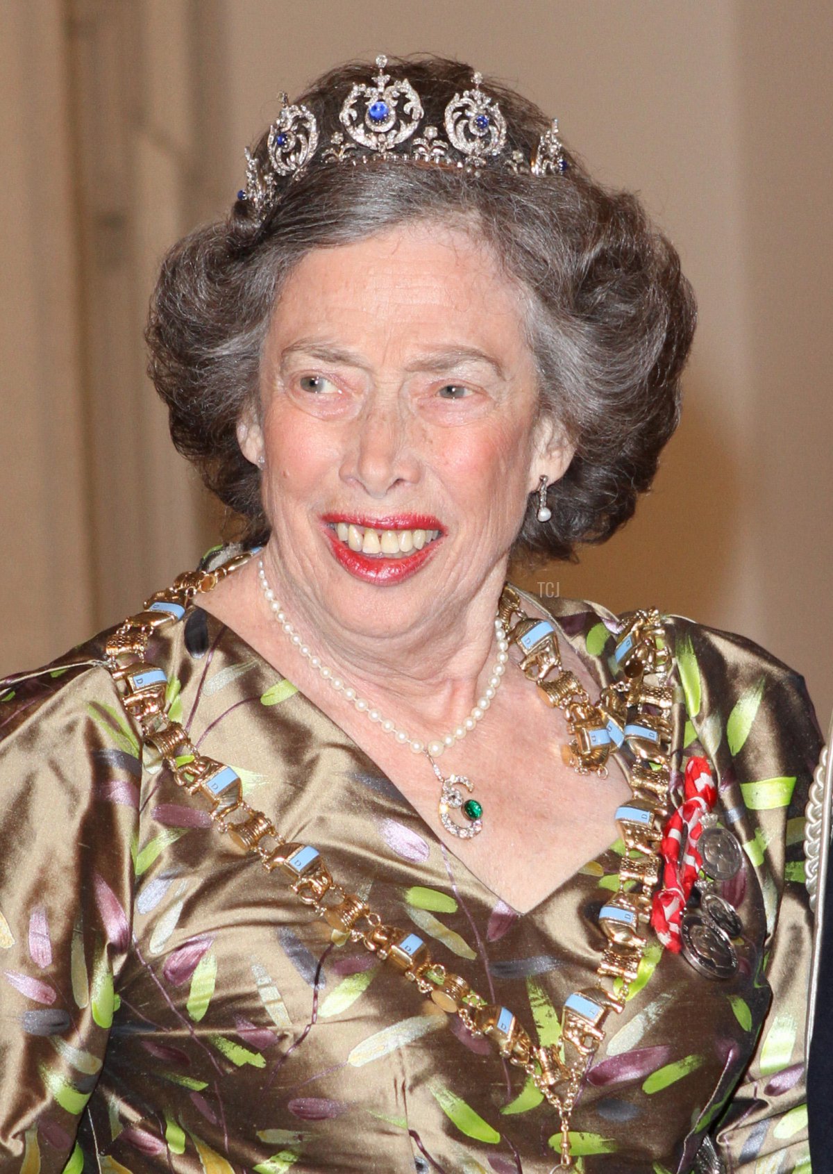 Indeed, Princess Elisabeth wore the tiara often for gala events over the years. The picture above, showing Elisabeth wearing the tiara, was taken at Christiansborg Palace in May 2004 during the wedding celebrations for Crown Prince Frederik and Crown Princess Mary. (According to Jensen, the sapphire pendant she wears here also belonged to Princess Thyra. The diamond crown brooch is Grand Duchess Anastasia Mikhailovna’s Coronation Brooch, which is now part of the Danish royal collection.)