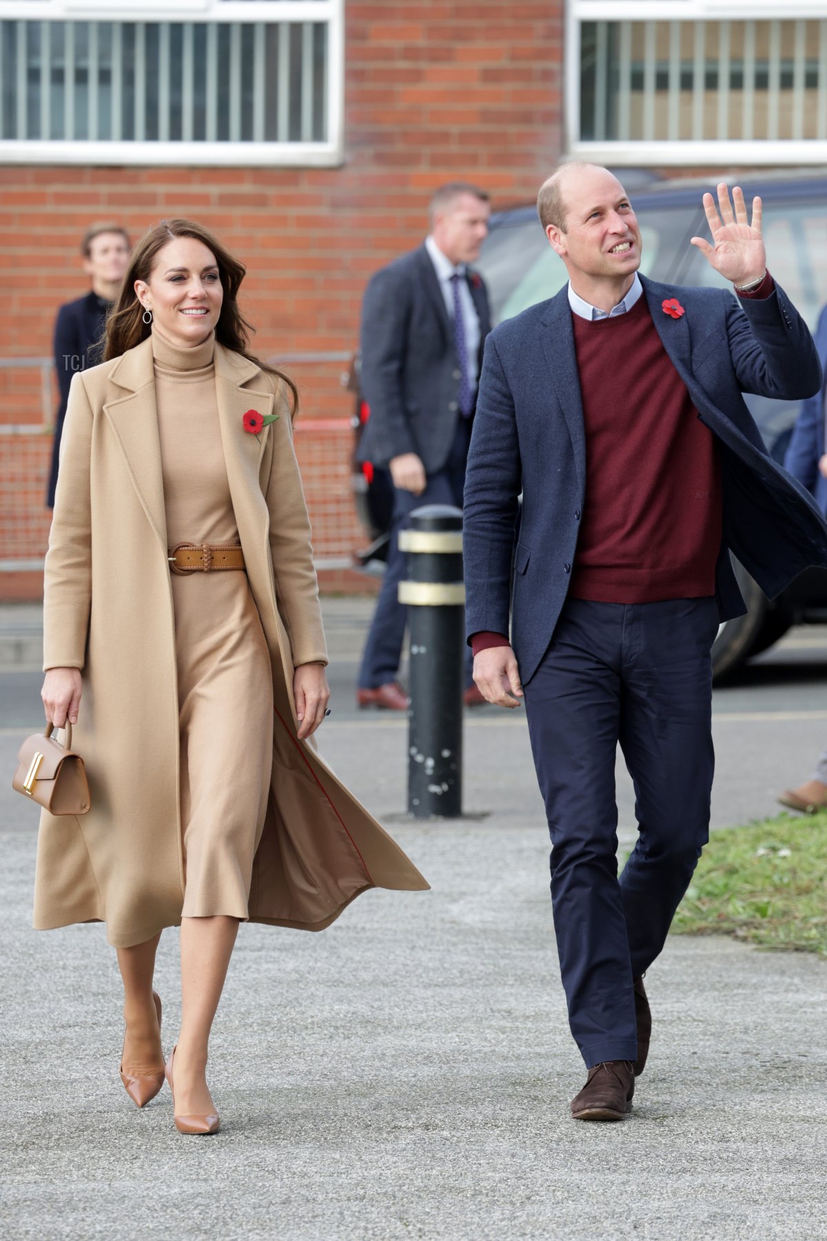 For the visit, Kate was elegant in a monochromatic camel ensemble, including a coat and a matching sweater and skirt. She pinned a paper poppy to her lapel, a reminder that Remembrance Sunday is coming up soon. (The commemorations are next weekend, with the Festival of Remembrance on November 12 and Remembrance Sunday on November 13.)