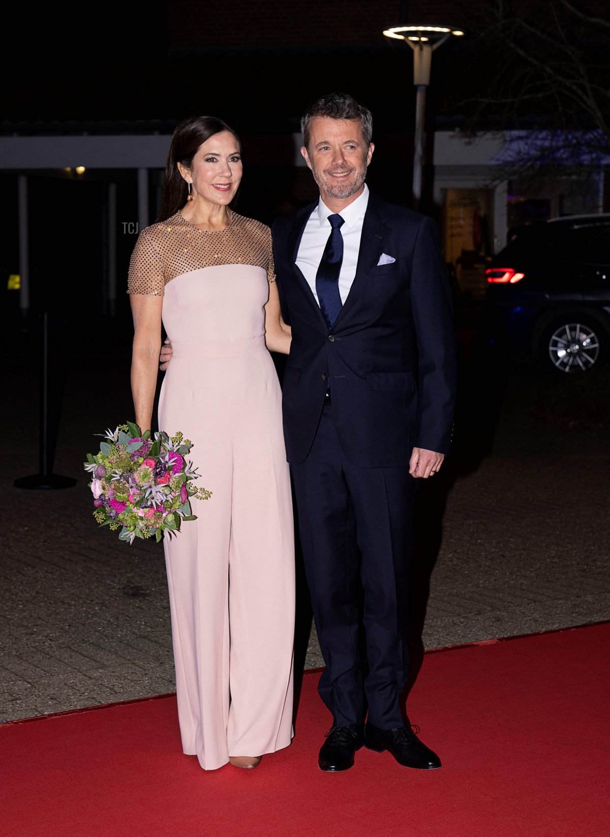 For the event, Crown Princess Mary chose an eye-catching pink jumpsuit from Stella McCartney. The outfit came with some sparkle of its own, thanks to its metallic mesh neckline. (Thanks to UFO No More for the ID!)