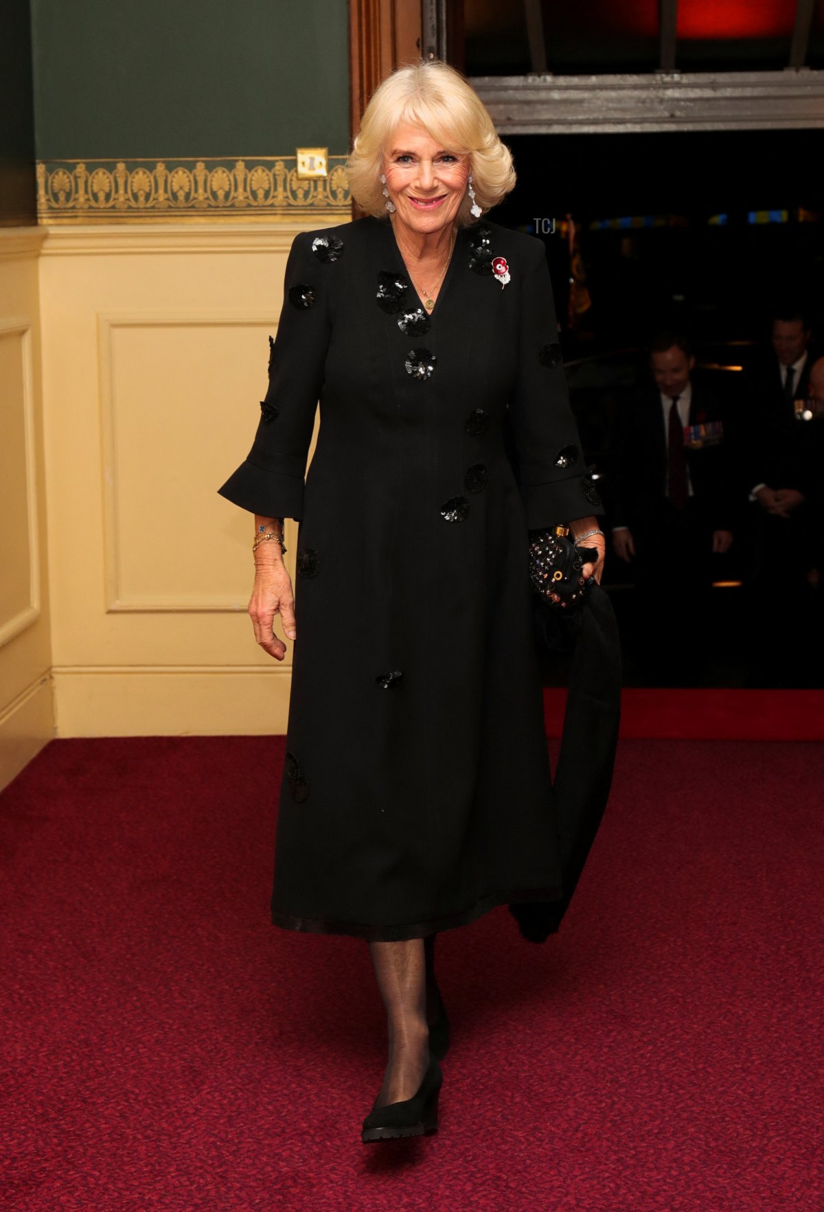 Queen Camilla wore a black coat dress with subtle sequin embellishments for the occasion.