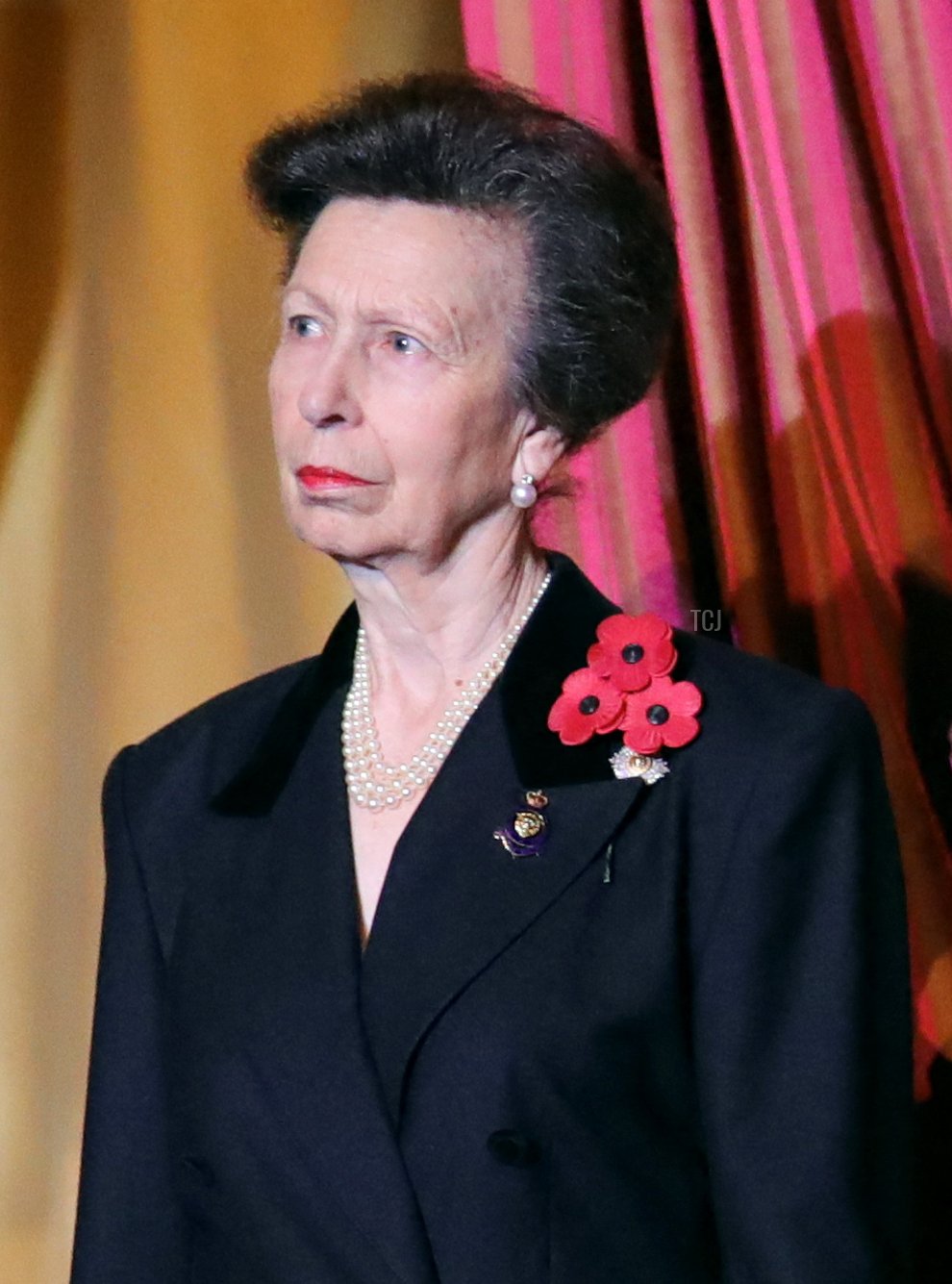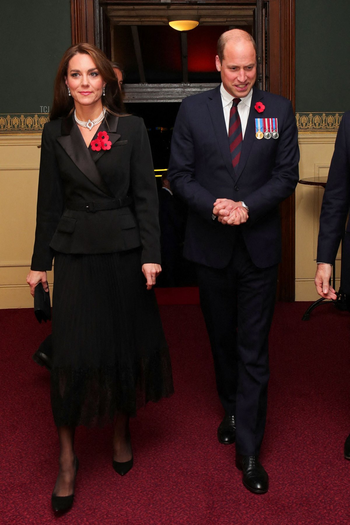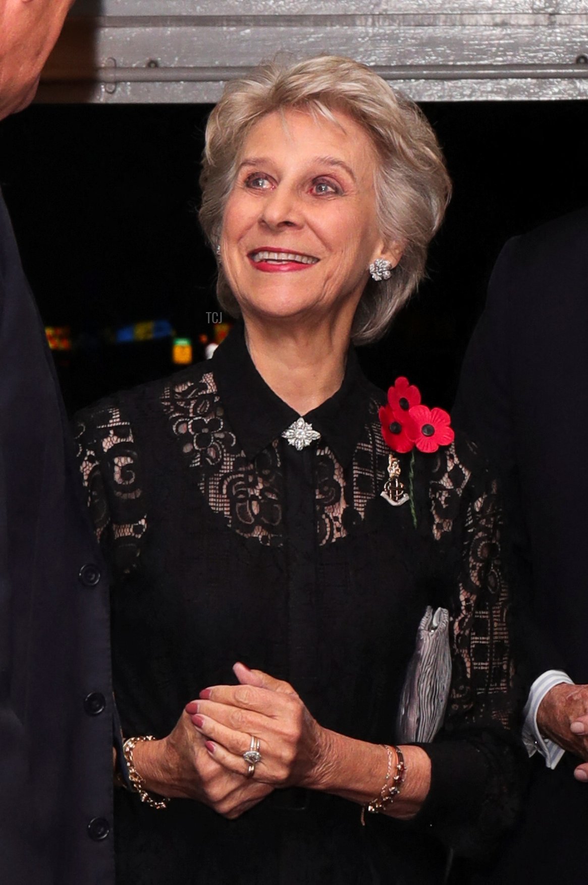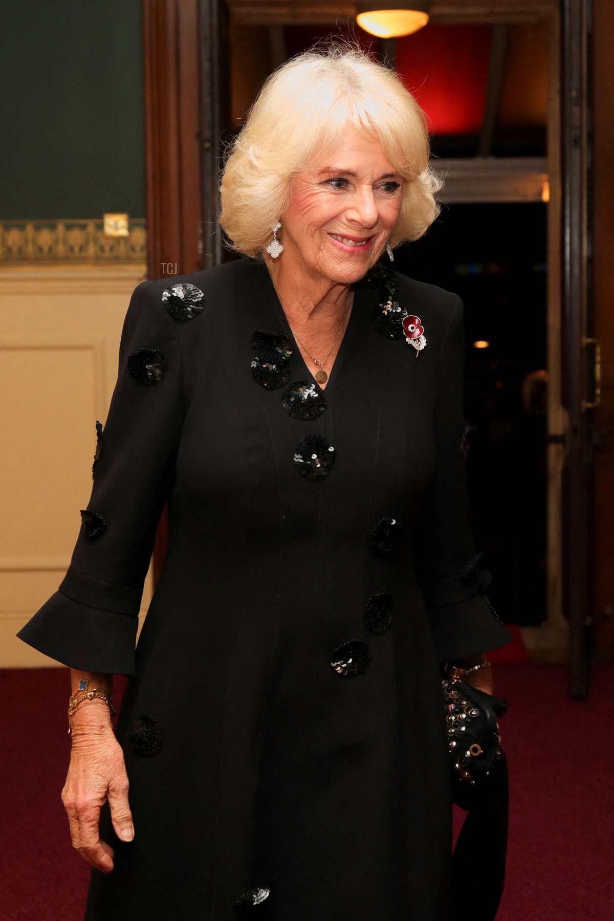 Her jewelry for the evening included her diamond Van Cleef & Arpels Magic Alhambra earrings, a diamond disc pendant engraved with the initials of her grandchildren, and a crystal poppy brooch.