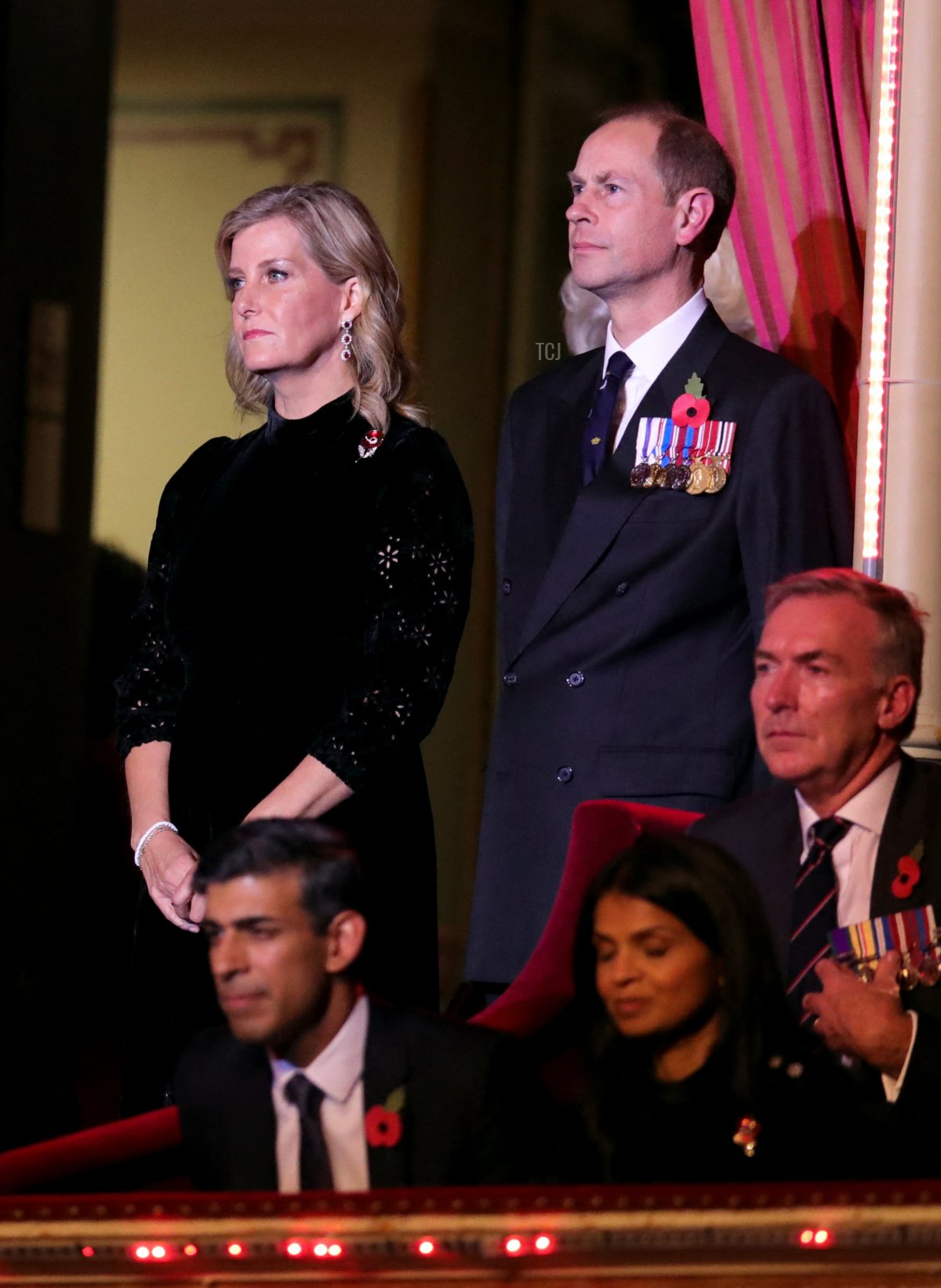 Sophie wore a crystal poppy (the same design worn by Camilla, I believe) with gorgeous ruby and diamond cluster pendant earrings.