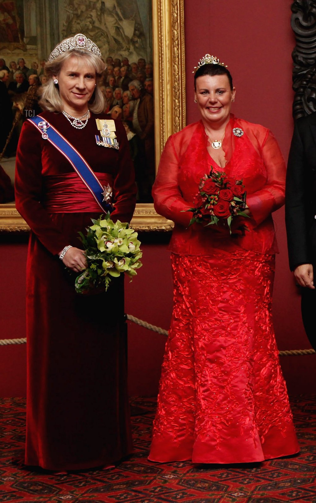 For the dinner, Birgitte wore a lovely deep red velvet evening gown and the insignia of the Royal Victorian Order, as well as Queen Elizabeth II’s Royal Family Order and her miniature medals. She decided on an interesting jewel pairing with the dress, wearing the pink topazes from her jewelry box with the red gown. I quite liked this combination—the translucency of the topazes contrasted nicely with the heavier red of the velvet.