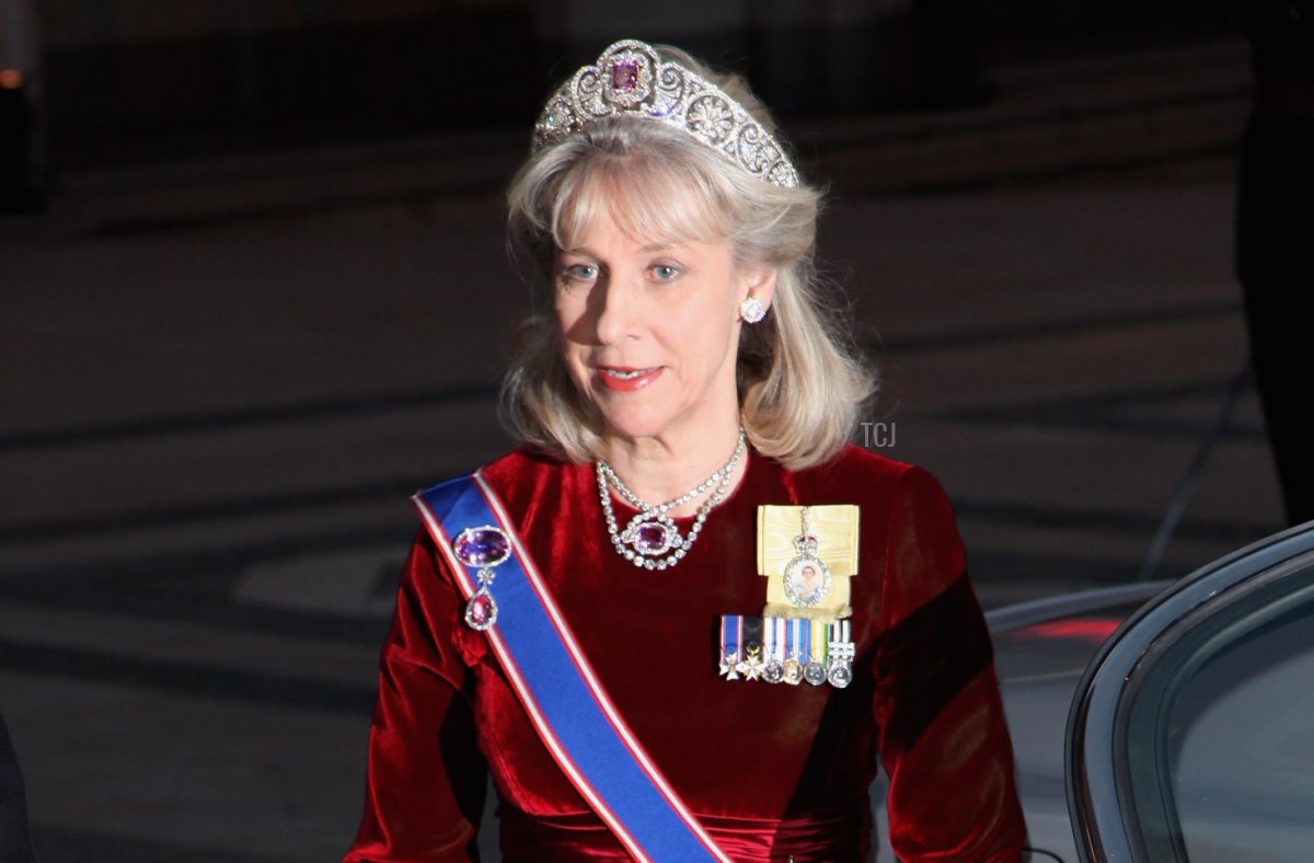 The jewels in question have been worn by members of the family for three generations. The tiara, Queen Mary’s Honeysuckle Tiara, was passed down from Queen Mary to Birgitte’s mother-in-law, Princess Alice. In fact, all of the jewels worn here—the tiara, necklace, earrings, brooch, and bracelet—were worn by Alice during her tenure as Duchess of Gloucester. With the help of her mother-in-law, Alice assembled an interesting and timeless jewelry collection, and Birgitte has worn it well over the years, too.