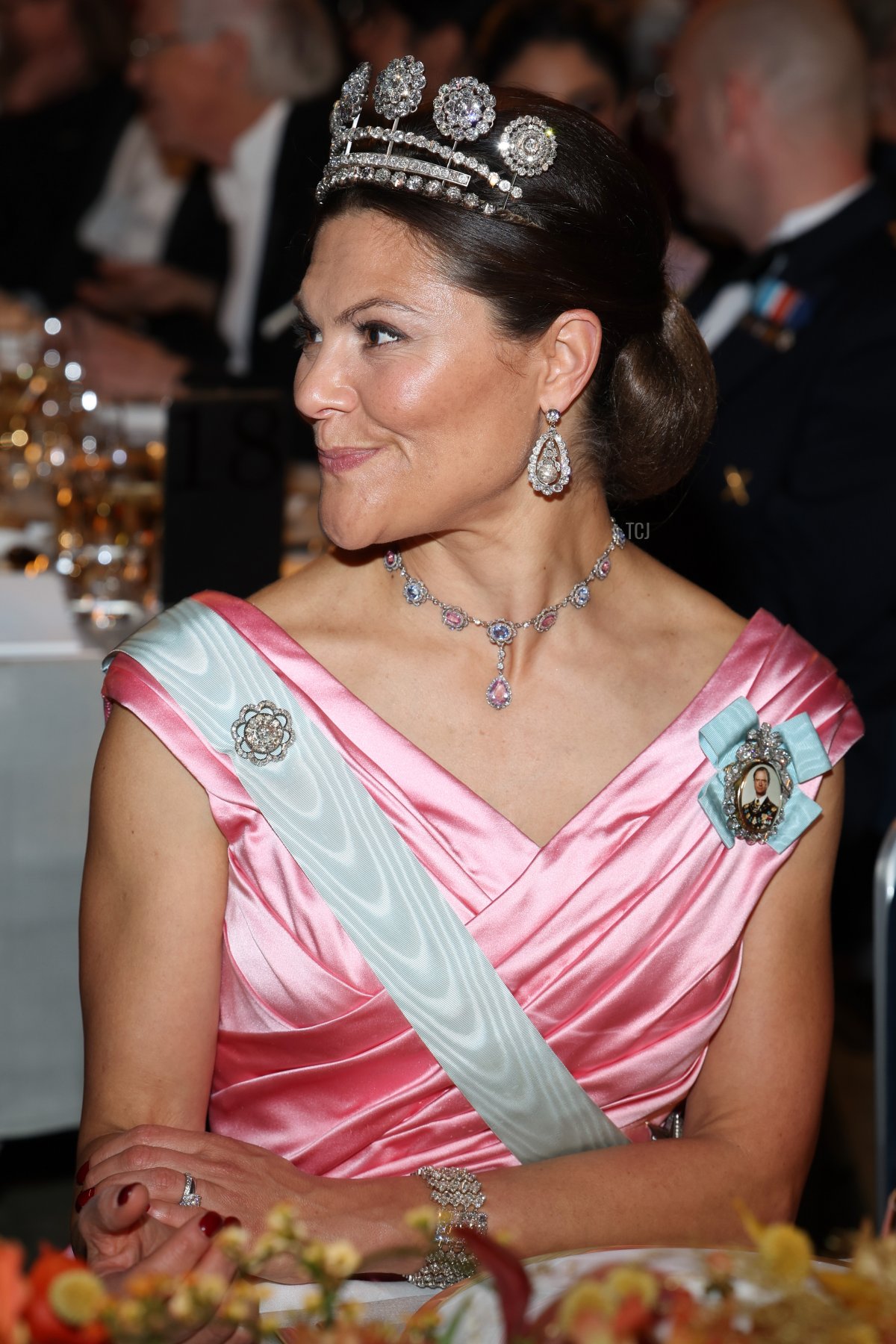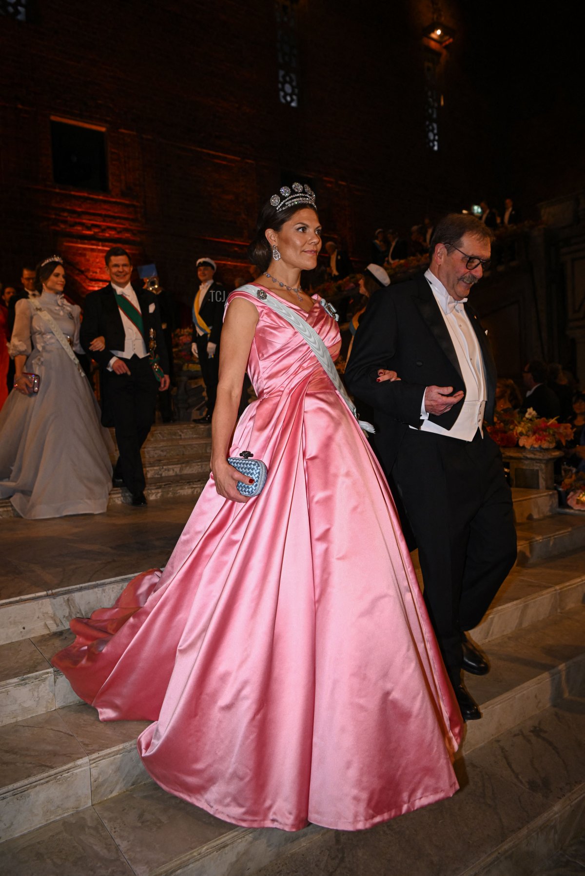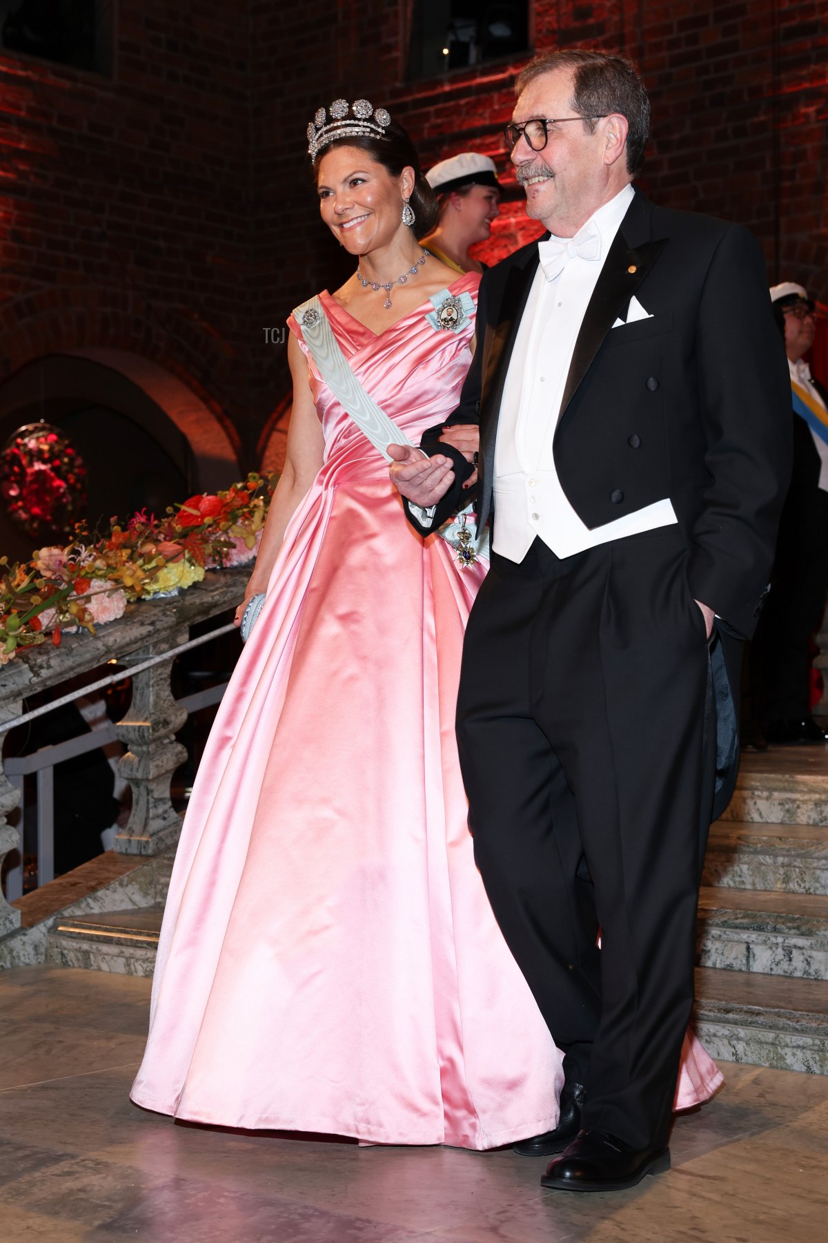 For the ceremony and the banquet held afterward, Victoria gleamed in a pink satin gown designed by Camilla Thulin.