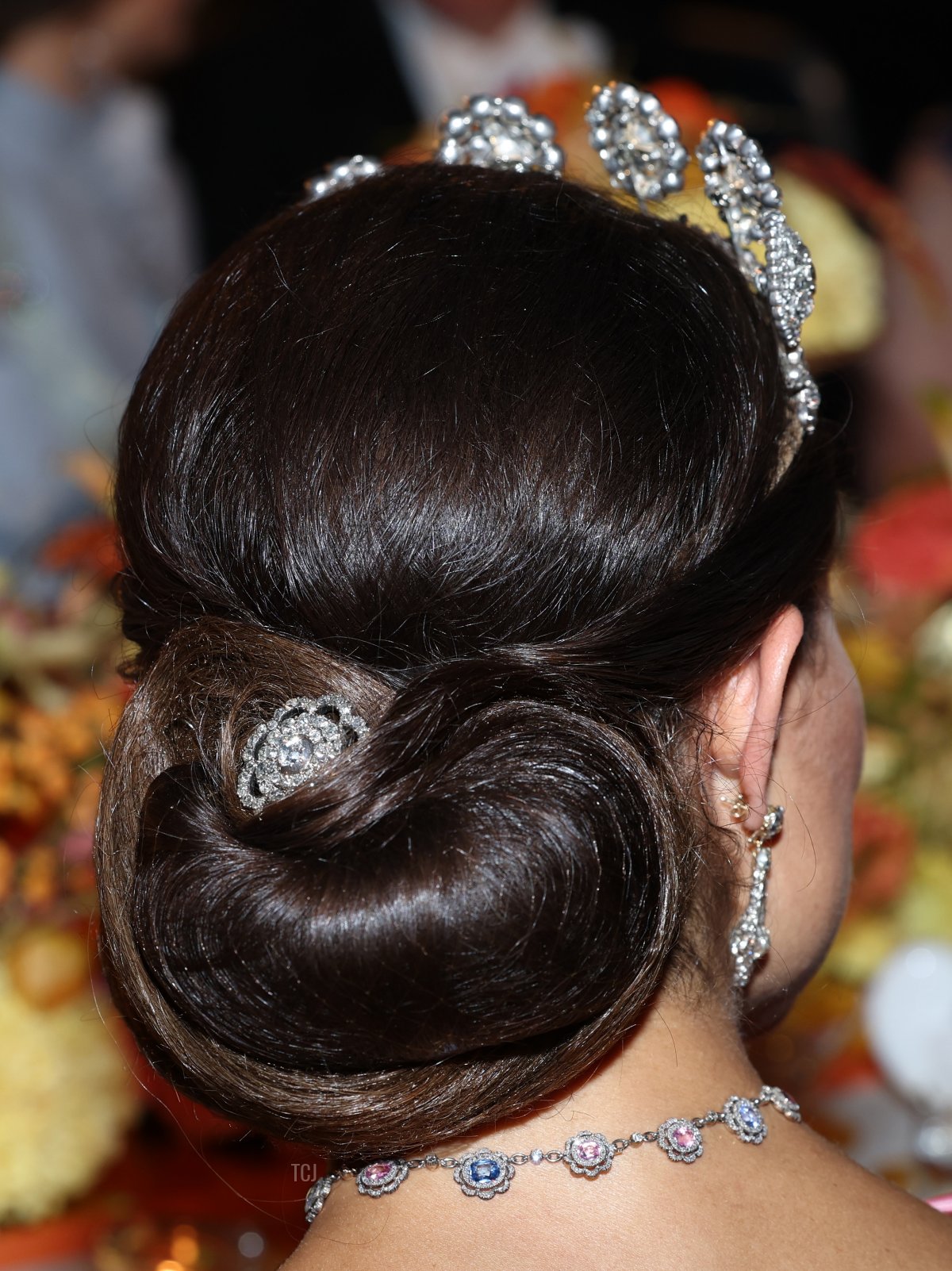 An identical diamond rosette brooch was also placed as an ornament in her hair.