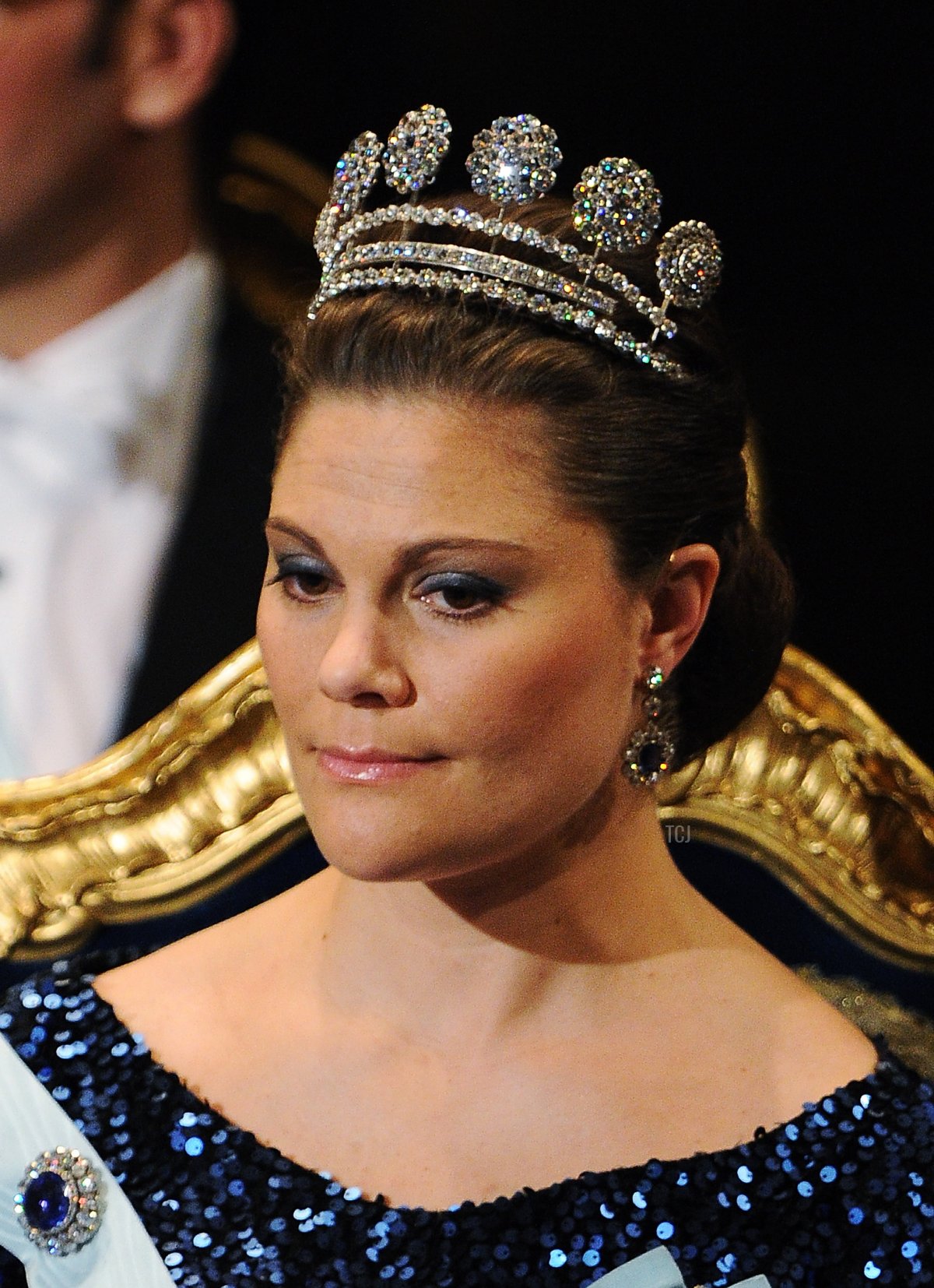 For the first time in more than a decade, Victoria wore the Diamond Six-Button Tiara for the Nobel ceremony and banquet. The tiara, which features six diamond rosettes set atop a double row of diamonds, was constructed in the 1970s for Princess Lilian’s use. But the rosettes themselves have a much longer history: the buttons once belonged to Queen Lovisa Ulrika (wife of an 18th-century Swedish monarch, King Adolf Frederik), and they were later affixed to King Carl XIV Johan’s coronation crown in 1818. The family calls the jewel the “Carl Johan Tiara” for this reason. An extra row of diamonds was added to the velvet base of the tiara for this outing.