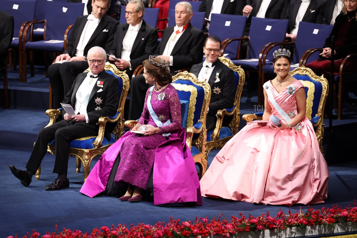 Crown Princess Victoria and Prince Daniel joined her parents, King Carl XVI Gustaf and Queen Silvia of Sweden, on stage at the Stockholm Concert Hall for the annual Nobel Prize ceremony on Saturday.