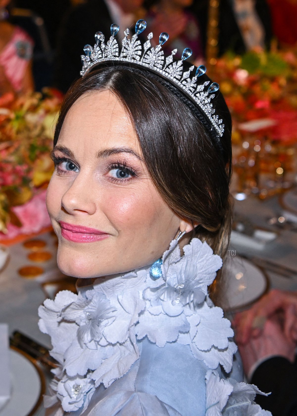 Princess Sofia wore a misty gray-blue gown by Ida Lanto for this year’s ceremony and banquet. The gown featured floral applique details at the neckline, on the bodice, and on the skirt.