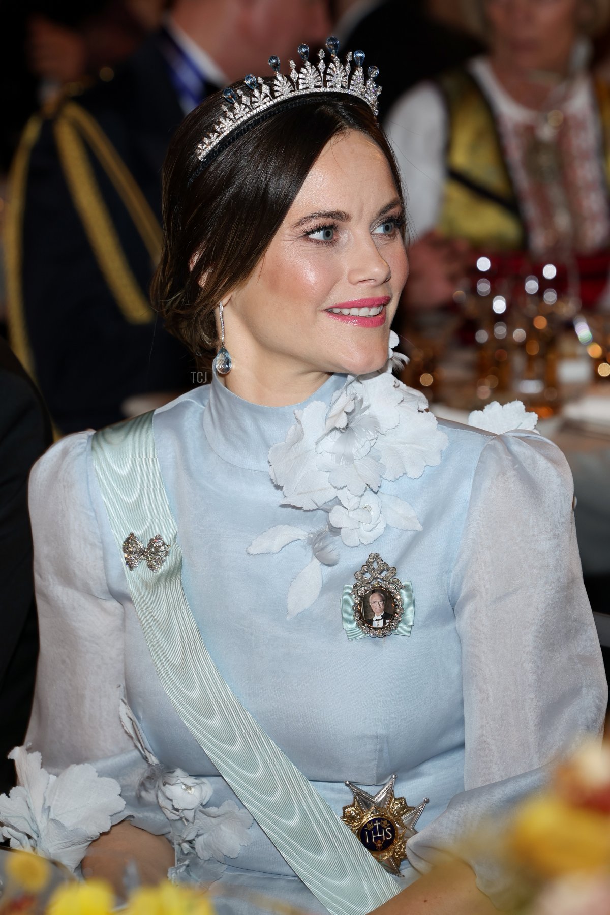 The blue ribbons of her decorations—King Carl XVI Gustaf’s Royal Family Order and the sash and star of the Order of the Seraphim—blended in with the light blue background of her gown. She was escorted into the banquet by Andreas Norlén, Speaker of the Riksdag, who (interestingly) wore the sash of the Order of Merit of the Italian Republic, plus the stars of his German, Dutch, Spanish, and Finnish orders.