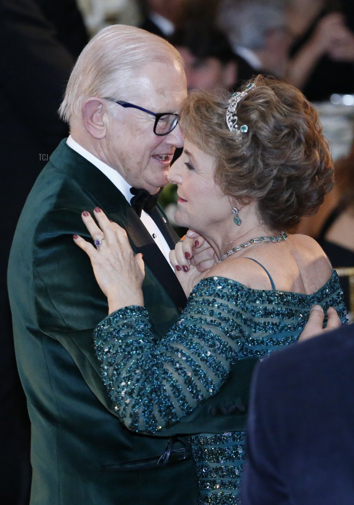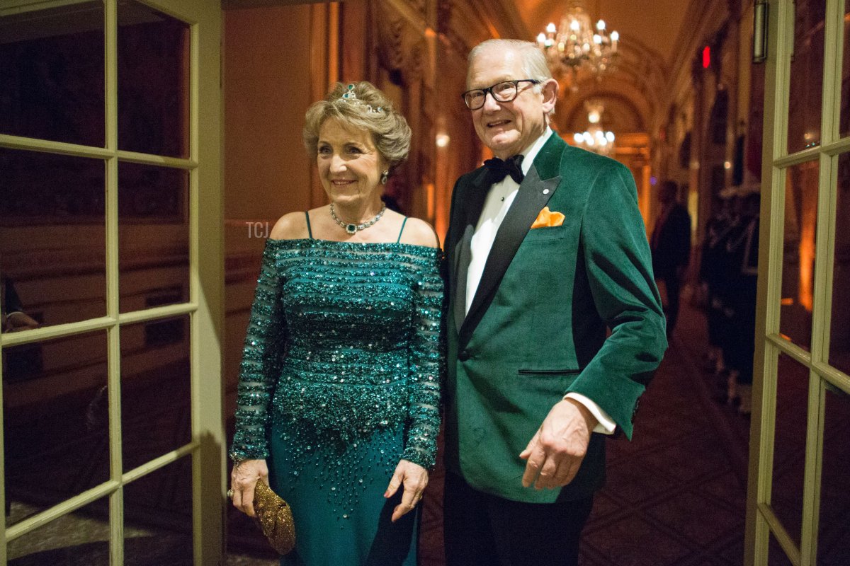 For the ball, both of the van Vollenhovens wore elegant ensembles in shades of green. Princess Margriet’s sparkling evening gown coordinated with her husband’s velvet evening jacket, and his gold pocket square matched her evening bag.