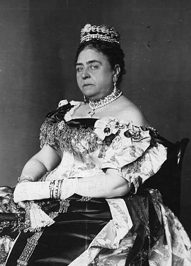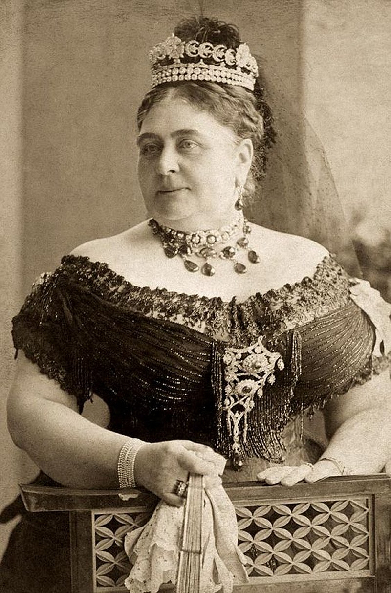 About a decade later, in 1866, Princess Mary Adelaide married Prince Francis of Teck, a relative of the King of Württemberg. In 1871, they became Duke and Duchess of Teck. Mary Adelaide also remained part of the royal circle of her cousin, Queen Victoria, and had plenty of opportunities to wear her royal jewels at court. The collection included the rose and crescent tiara, as well as a diamond hoop necklace and her mother’s collection of emeralds. She wore the bandeau-style tiara both with and without supplementary rows of diamonds at its base.