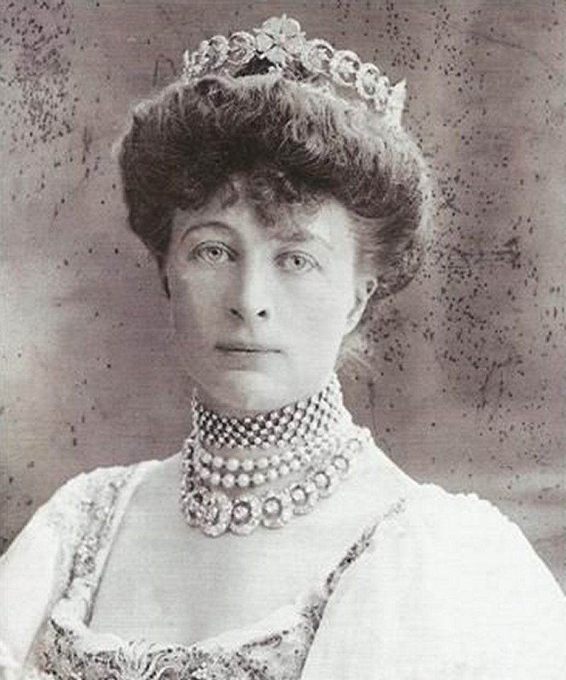 Prince Adolphus may have been the heir to a German dukedom, but he married into a solidly English aristocratic family. His wife was Lady Margaret Grosvenor, daughter of the 1st Duke of Westminster. As Duchess of Teck, Margaret wore the rose and crescent tiara for the coronation of her brother- and sister-in-law, King George V and Queen Mary, in 1911. This portrait was taken during the coronation festivities, and it’s signed with the Duchess’s nickname, “Meg.” (Her husband was “Dolly” to the family.) You’ll note that Margaret is wearing the diamond hoop necklace as well.