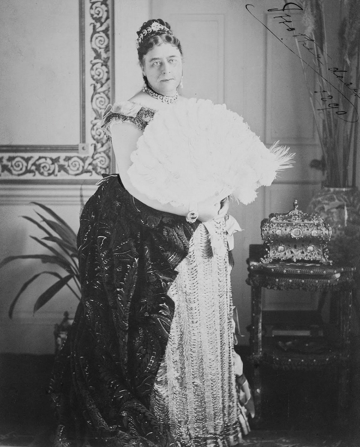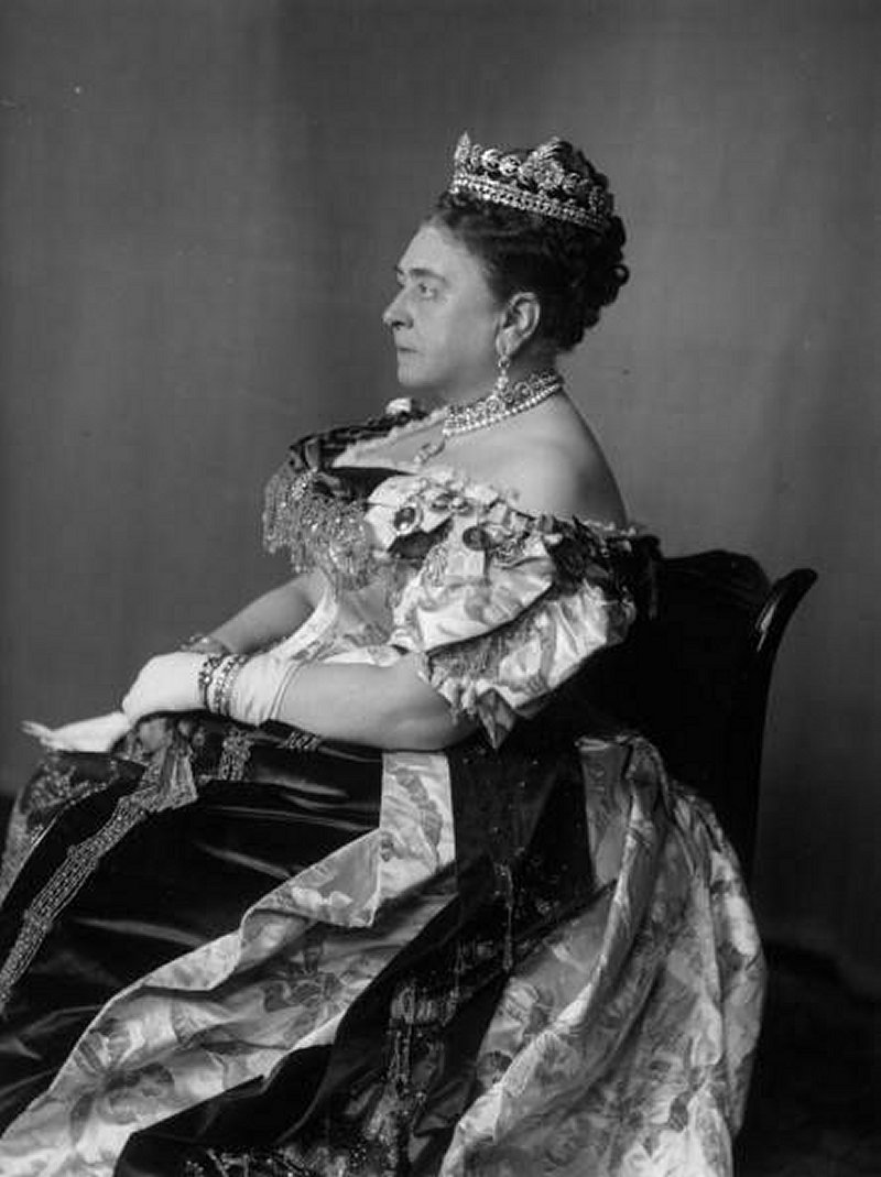 The pose used by Tuxen in the painting appears to be based on this photograph of Mary Adelaide. (I’m not sure whether it was taken as a study for the portrait or for a separate occasion.) In the photo, Mary Adelaide wears the rose and crescent tiara (with supplementary diamonds at the base), as well as the diamond hoop necklace.