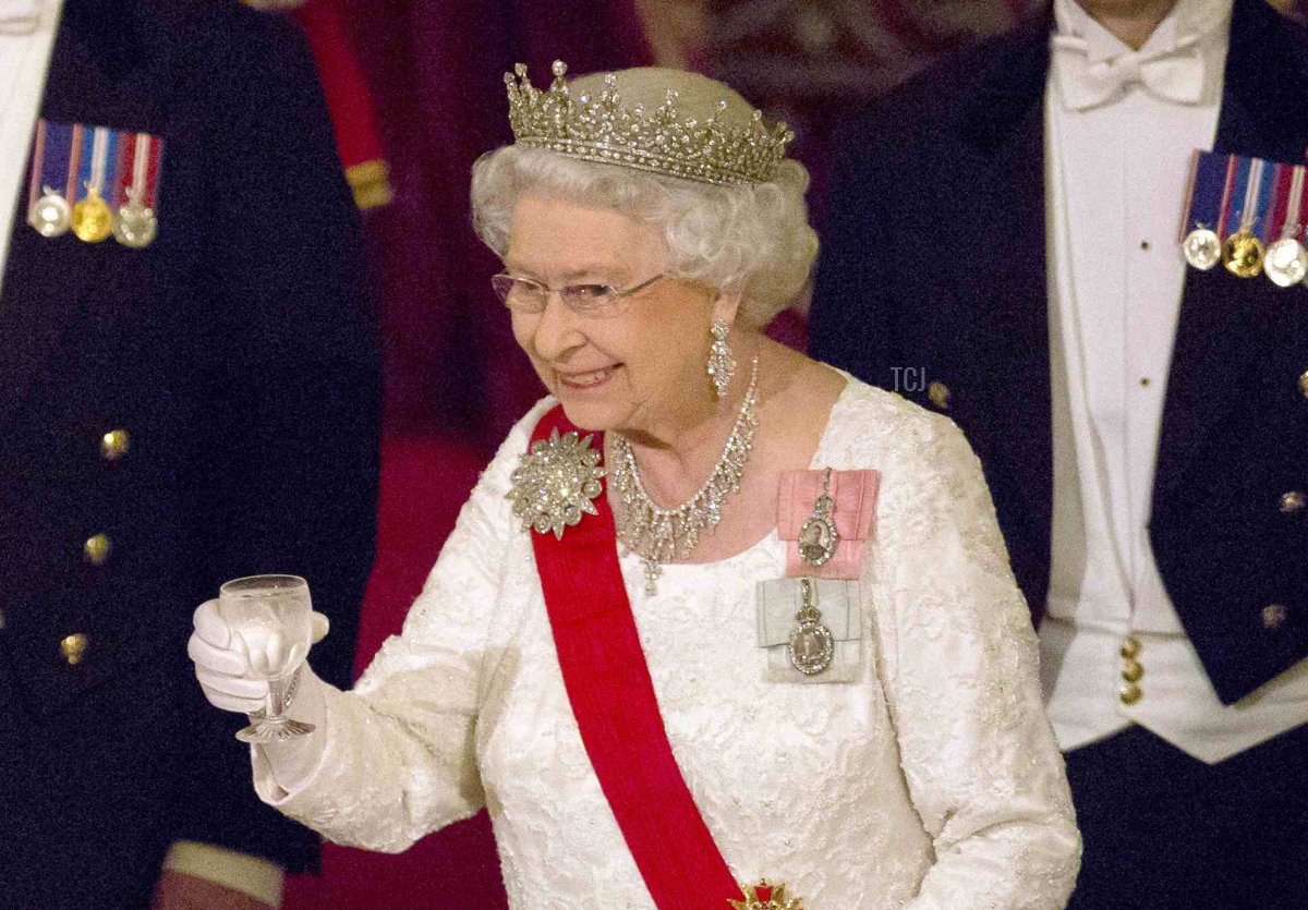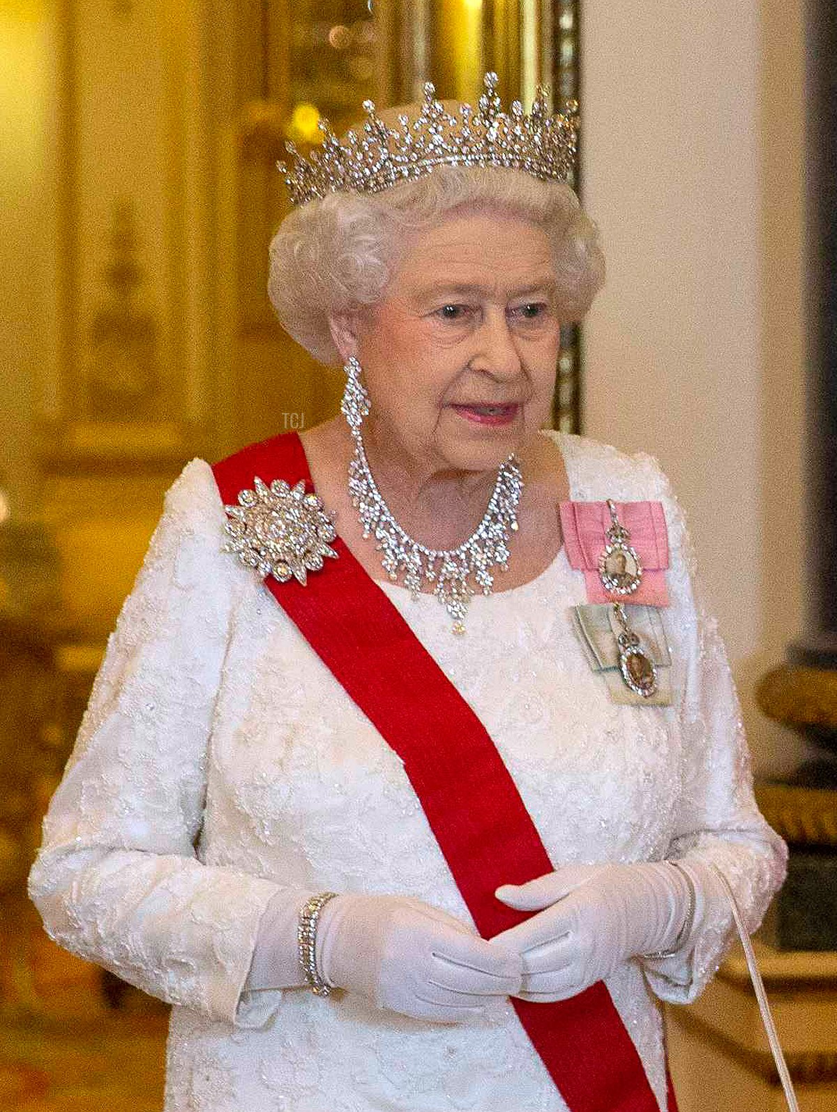 One of the late Queen’s most recent appearances in the suite came about a decade ago, when she wore the earrings and necklace for the South Korean state banquet at Buckingham Palace in November 2013. On that occasion, she paired the jewels with the Girls of Great Britain & Ireland Tiara and the center section of the Diamond Cockade Brooch, which is one of the Heirlooms of the Crown.