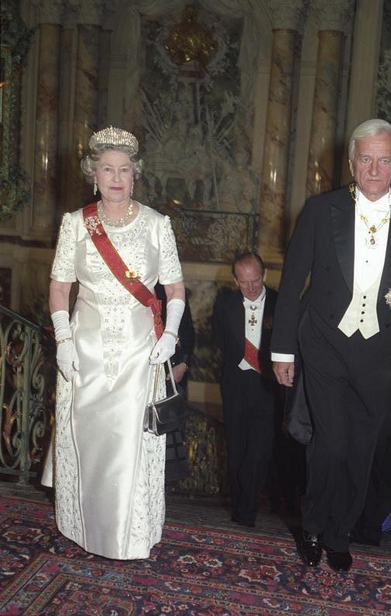 The Queen wore the necklace and earrings on occasion in the following years. She paired the jewels with Queen Alexandra’s Kokoshnik and Queen Mary’s Lover’s Knot Brooch for a dinner during her state visit to Germany in 1992.
