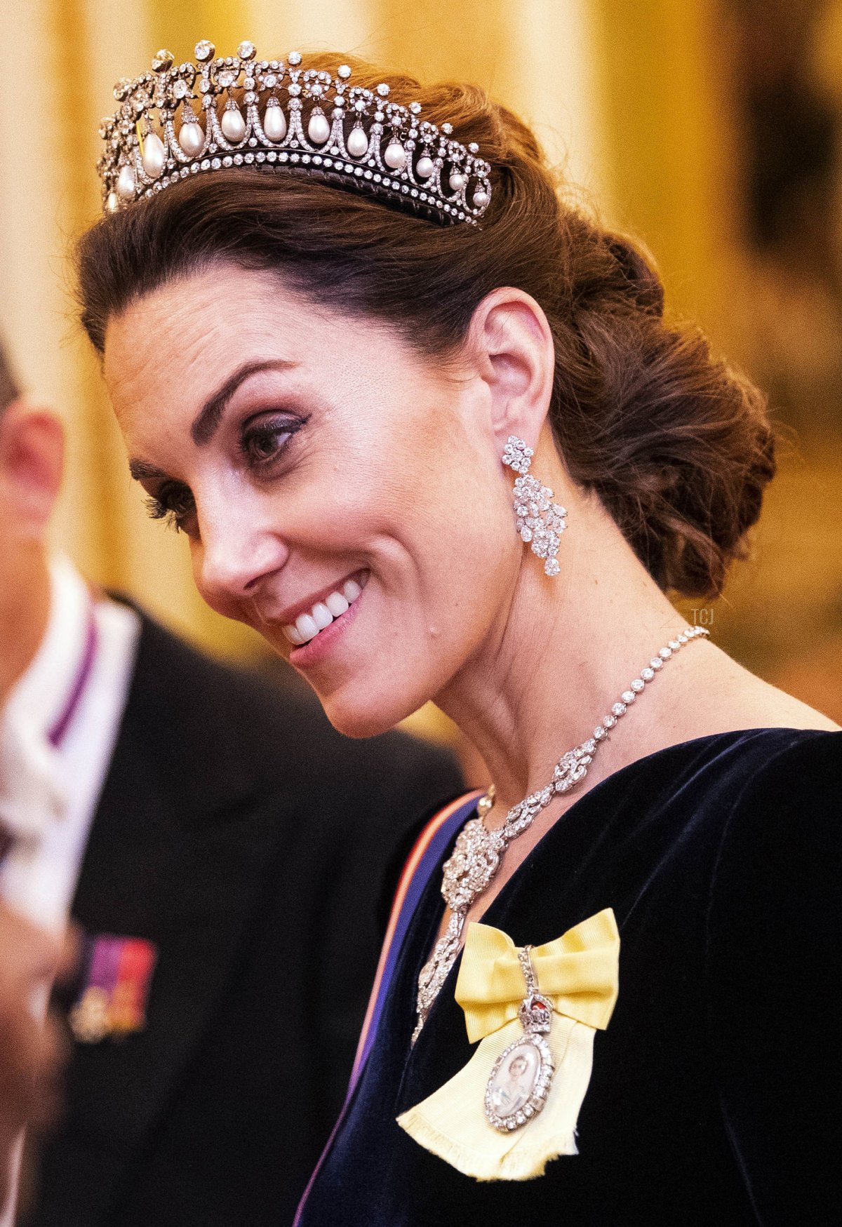 A few months later, in December 2019, the then-Duchess of Cambridge wore the earrings with Queen Mary’s Lover’s Knot Tiara for the annual diplomatic reception. Rather than wearing the matching necklace from the set, she chose to wear the Nizam of Hyderabad Necklace for the occasion.